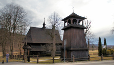 ARCHITEKTURA. Drewniany, konstrukcji zrębowej, o ścianach pobitych częściowo gontem częściowo szalowanych. Jednonawowy z prezbiterium zamkniętym trójbocznie, przy którym od północy zakrystia a od południa kaplica. Przy nawie od zachodu, na całej szerokości przedsionek, obecnie włączony częściowo do nawy. Prezbiterium i nawa nakryte pozornymi sklepieniami kolebkowymi, w nawie z płaskimi odcinkami bocznymi. Wokół ścian nawy otwarte soboty. Dach dwuspadowy o wspólnej kalenicy, pobity gontami z wieżyczką na sygnaturkę, z latarnią. Kaplica nakryta dachem kopułowym. Na drzwiach głównych ozdobne okucia kowalskie z XVI lub XVII w. Na belce stropu w zakrystii data budowy kościoła 1697. Polichromia wnętrza figuralna z 1889 r., w prezbiterium na sklepieniu Wniebowzięcie NMP, w nawie: na sklepieniu czterej ewangeliści, na ścianach sceny z życia Marii: Narodzenie, Zwiastowanie, Niepokalane Poczęcie oraz Nawiedzenie św. Elżbiety, w nowej kaplicy polichromia figuralna malowana przez Piotra Grabowskego w 1966 r.