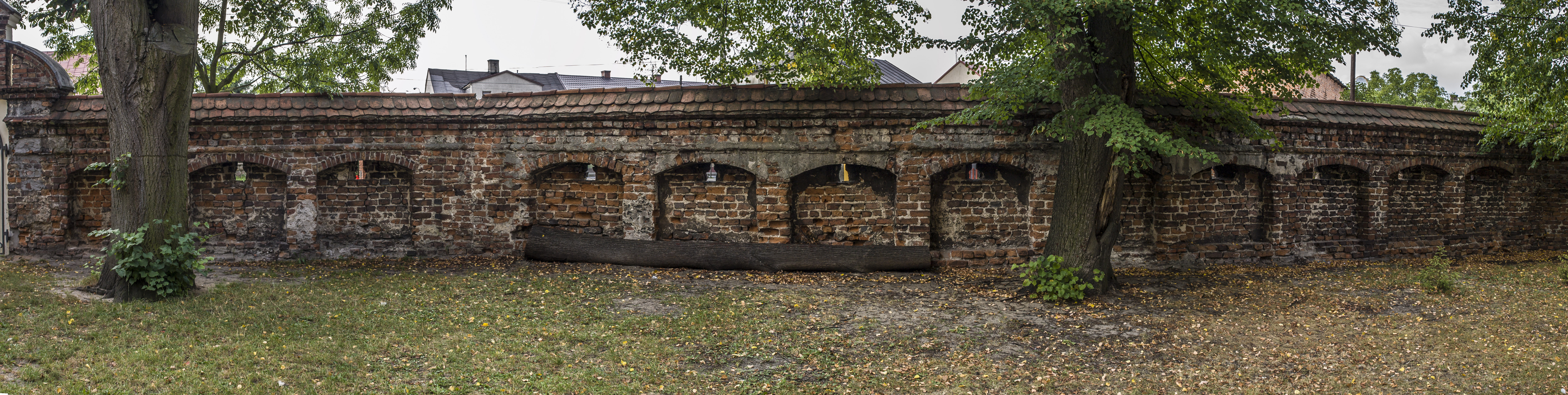 Cmentarz przykościelny otoczony ośmiobocznym murem o charakterze obronnym z wnękami od wewnątrz i otworami strzelniczymi o wykroju kluczowym. Do kościoła prowadzi XVIII-wieczna brama o formach barokowych, flankowana dwiema symetrycznymi furtkami. W kościele pochowani zostali m.in.: biskup Stanisław Pstrokoński (zm. 17 czerwca 1657 r.), Spytek Rogacjan Pstrokoński (zm. w 1687 r.), Konstanty Tymieniecki (zm. 17 sierpnia 1814 r.).