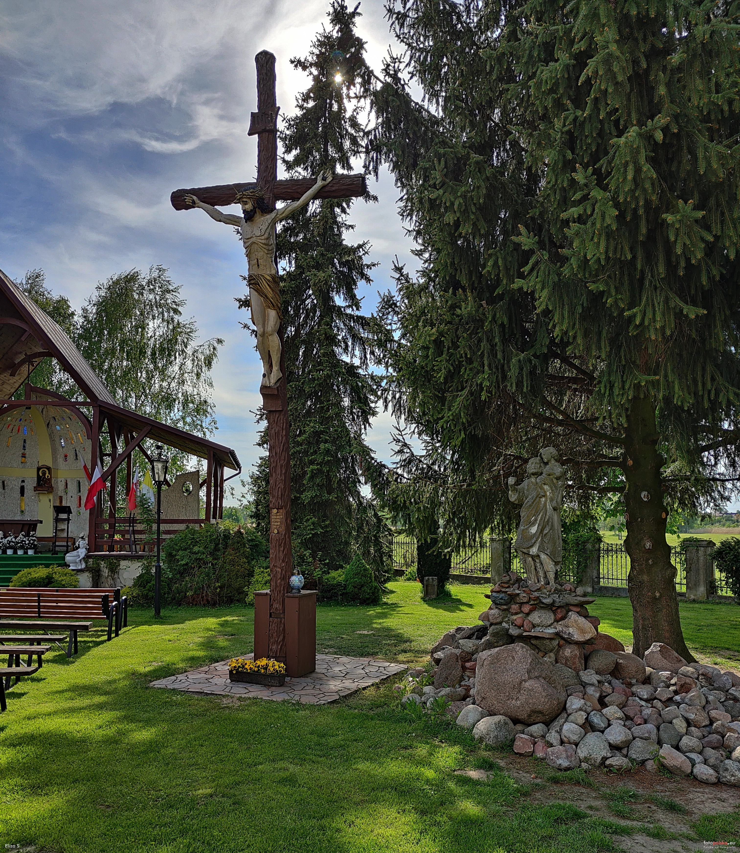 2 maja 2025 , Krzyż z rzeźbą ukrzyżowanego Jezusa Chrystusa na terenie Kościoła Nawrócenia św. Pawła w pobliżu ołtarza polowego. Z prawej kamienna rzeźba św. Józefa z Dzieciątkiem Jezus.Skomentuj zdjęcie |