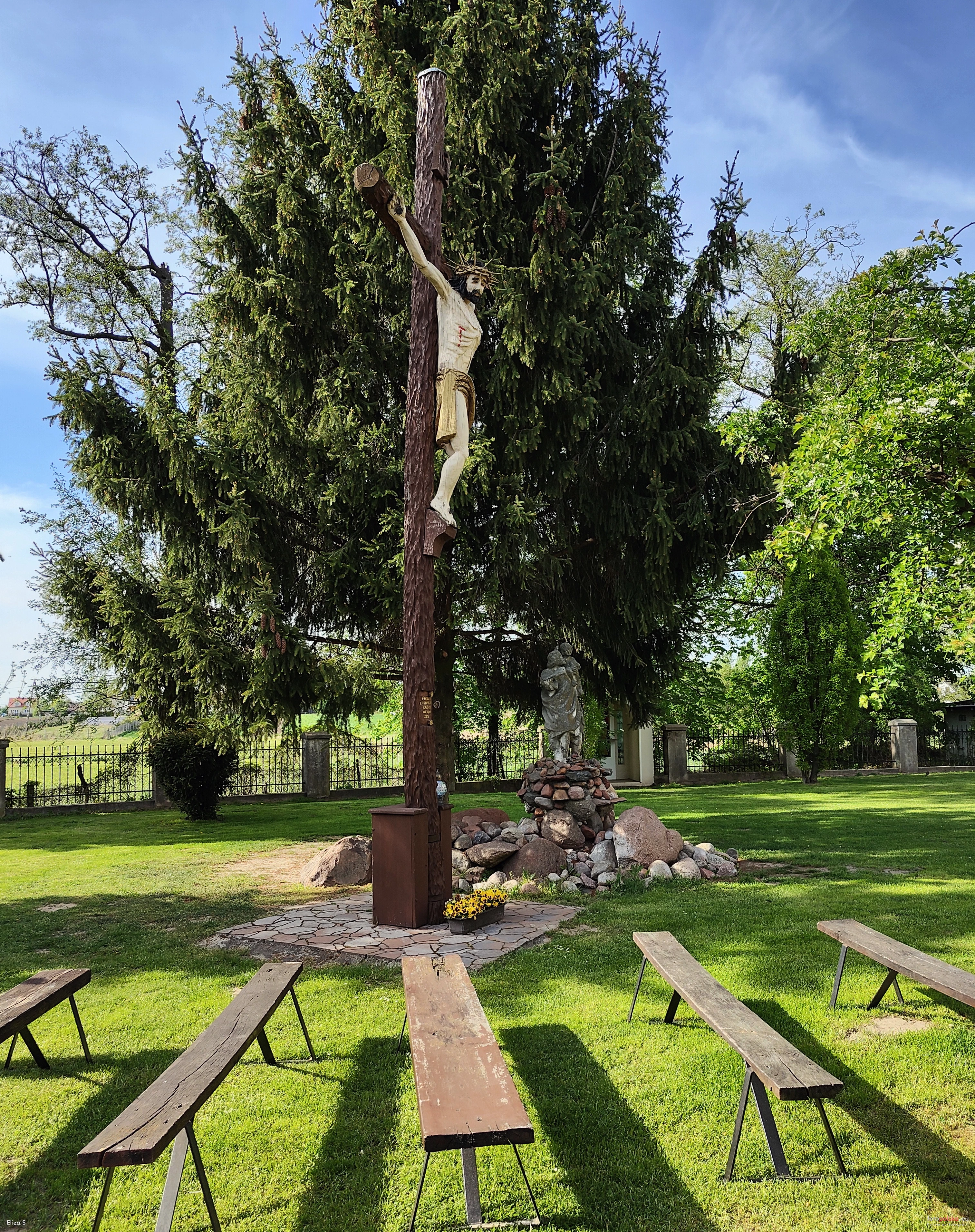 2 maja 2025 , Krzyż z rzeźbą ukrzyżowanego Jezusa Chrystusa na terenie Kościoła Nawrócenia św. Pawła w pobliżu ołtarza polowego. W głębi kamienna rzeźba św. Józefa z Dzieciątkiem Jezus.Skomentuj zdjęcie |