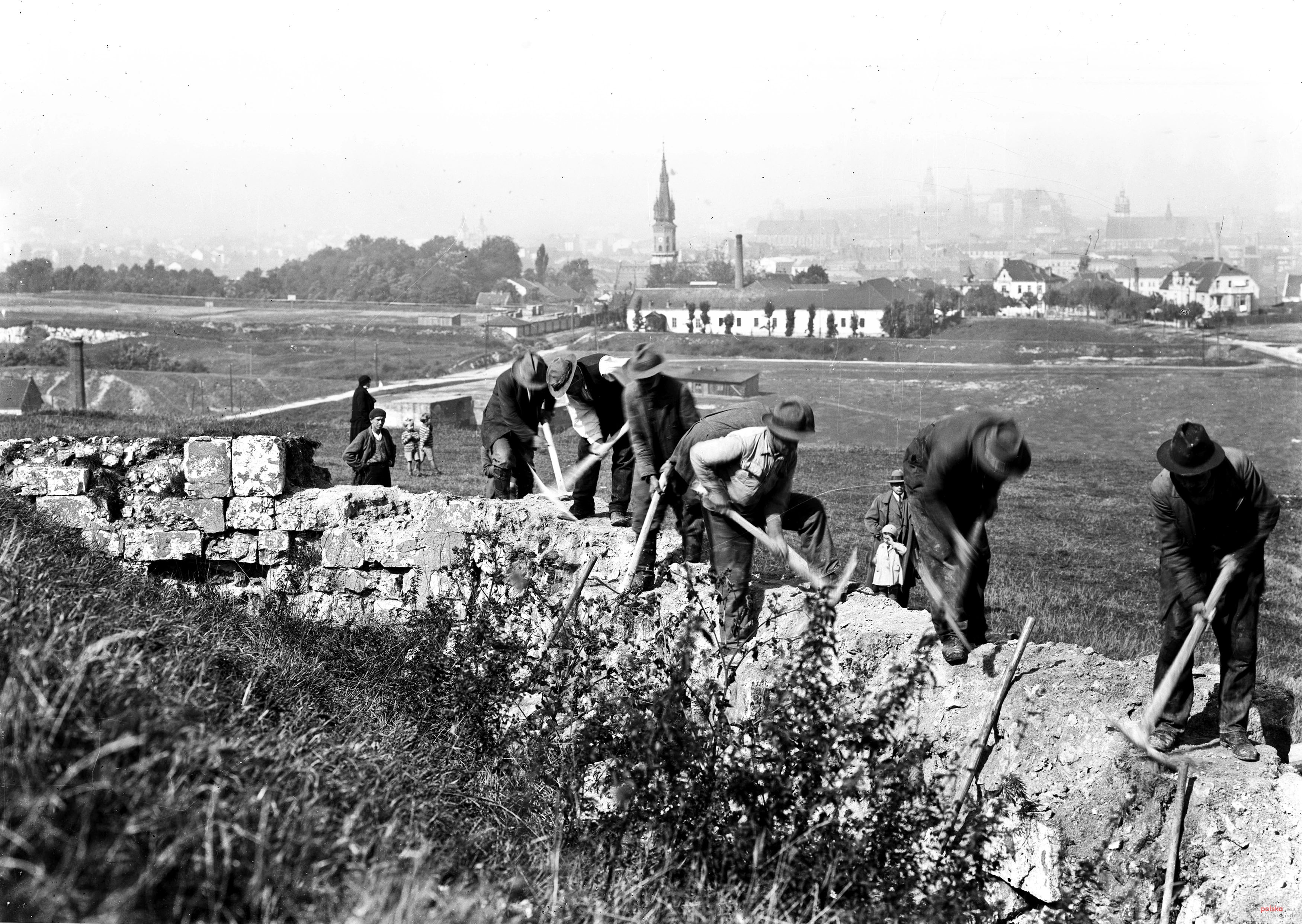 wrzesień 1933 , Panorama. Widok w kierunku północno-zachodnim. Na pierwszym planie robotnicy przy pracach na Kopcu Krakusa, w tle widoczny kościół św. Józefa na Podgórzu, w tle Wawel.