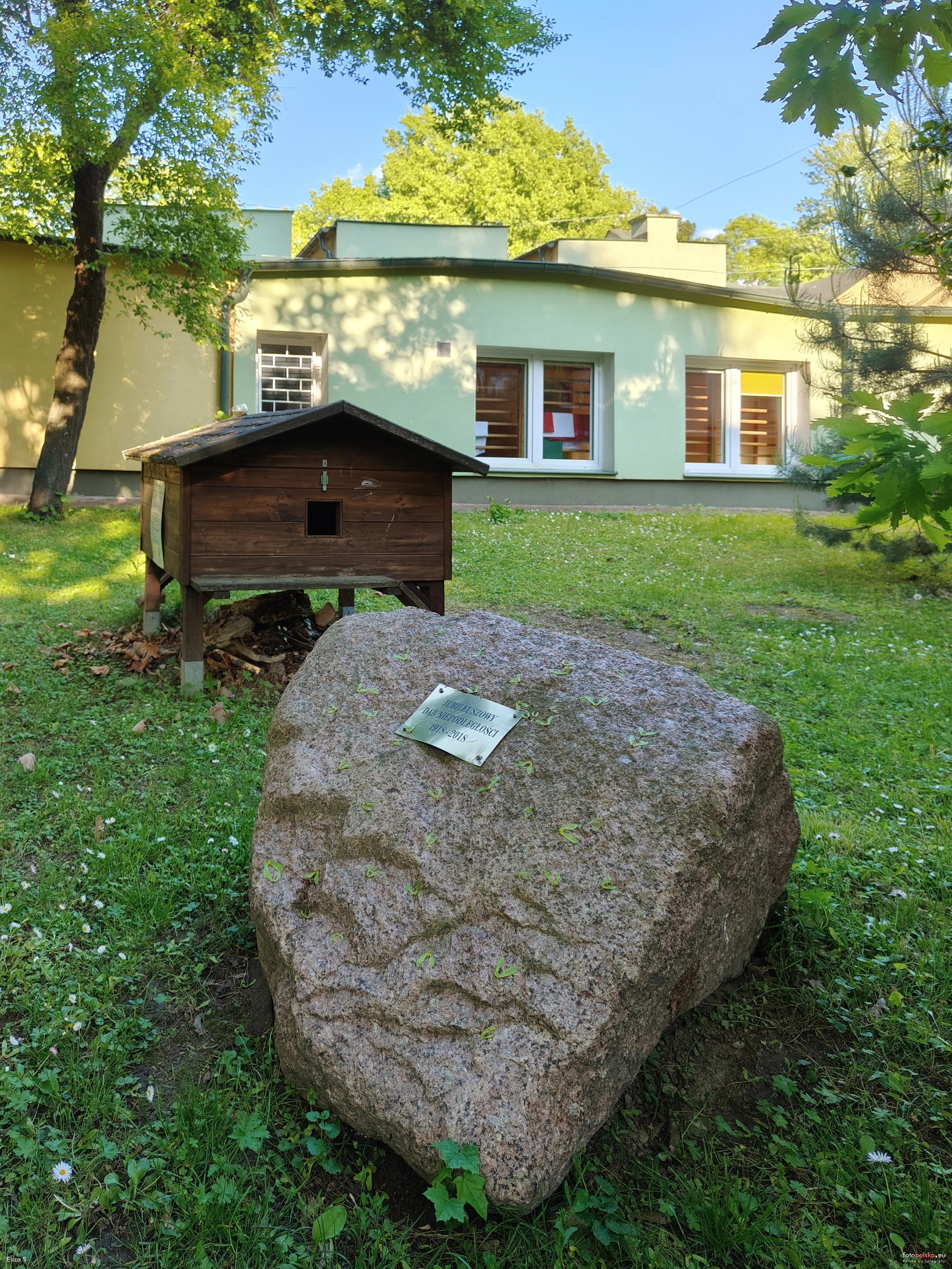20 maja 2025 , Dąb Niepodległości przy Przedszkolu Integracyjnym nr 39 ul. Balladyny 14 (w głębi). Głaz z tabliczką na pierwszym planie, "Koci domek" i w dali fragment budynku przedszkola.Skomentuj zdjęcie |