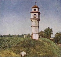 1923 , Kapliczka i kamienny krzyż w Starowicach na barwnej fotografii.Skomentuj zdjęcie