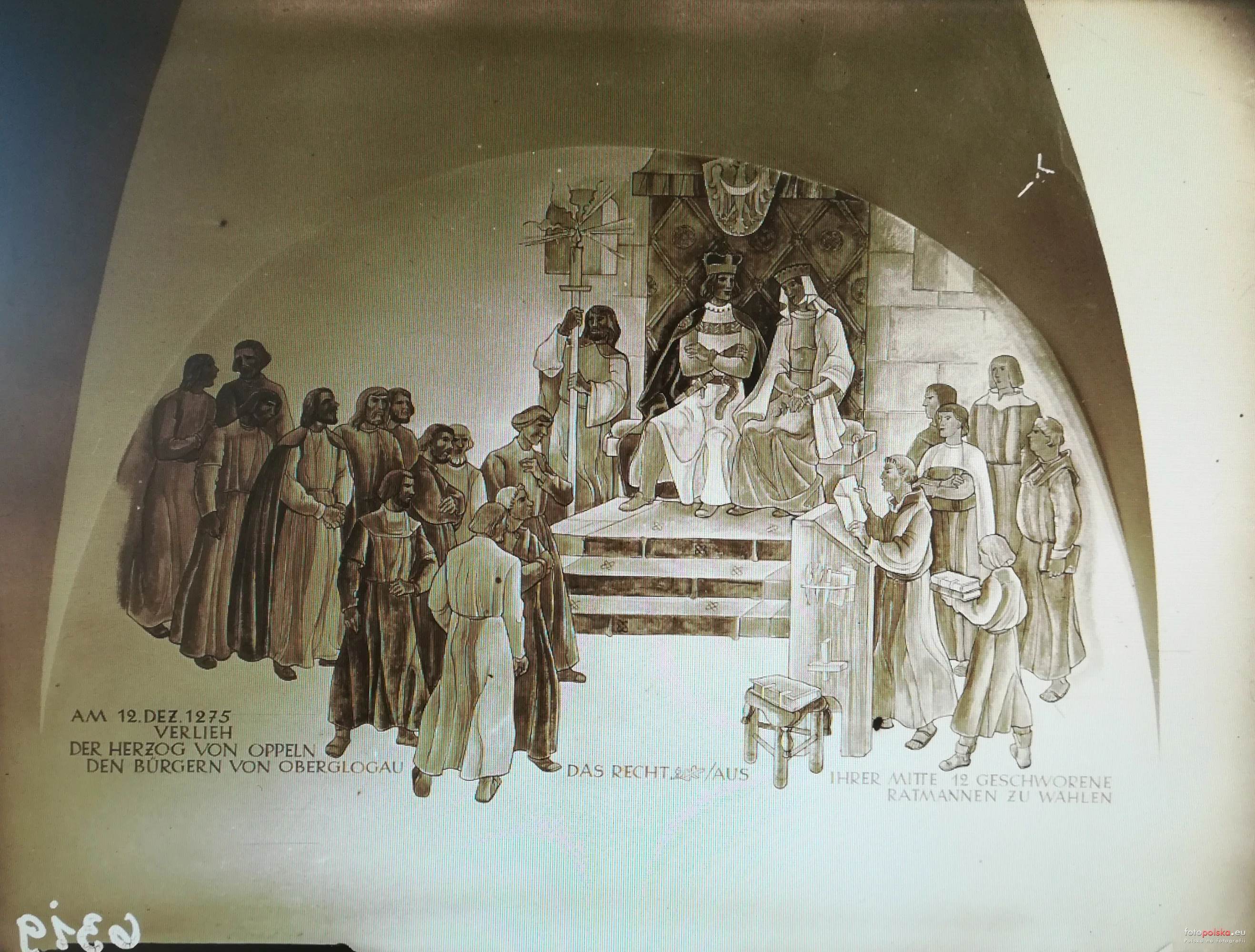 Lata 1942-1944 , Najistotniejsze wydarzenia z przeszłości Głogówka. Jest to dzieło wrocławskiego malarza Alberta Helma, wykonane w 1942 r. Książe opolski Władysław w dniu 12 grudnia 1275 roku nadał mieszkańcom Głogówka prawo wybierania radnych miejskich.Skomentuj zdjęcie |