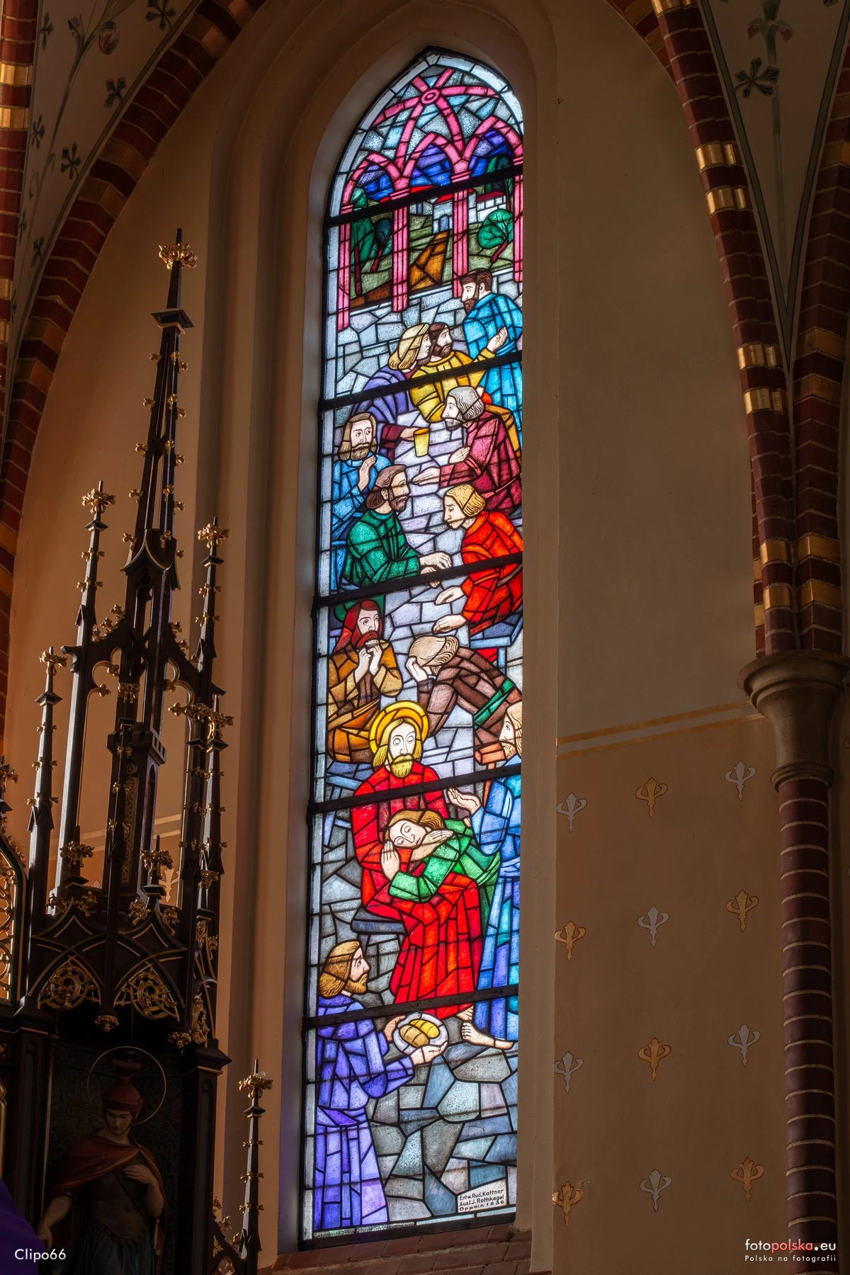 16 kwietnia 2025 , Witraż w prezbiterium, prawa strona, w dolnej części napis: Entw. Rud. Kattner Ausf. J. Rothkegel Oppeln 1936.Skomentuj zdjęcie |