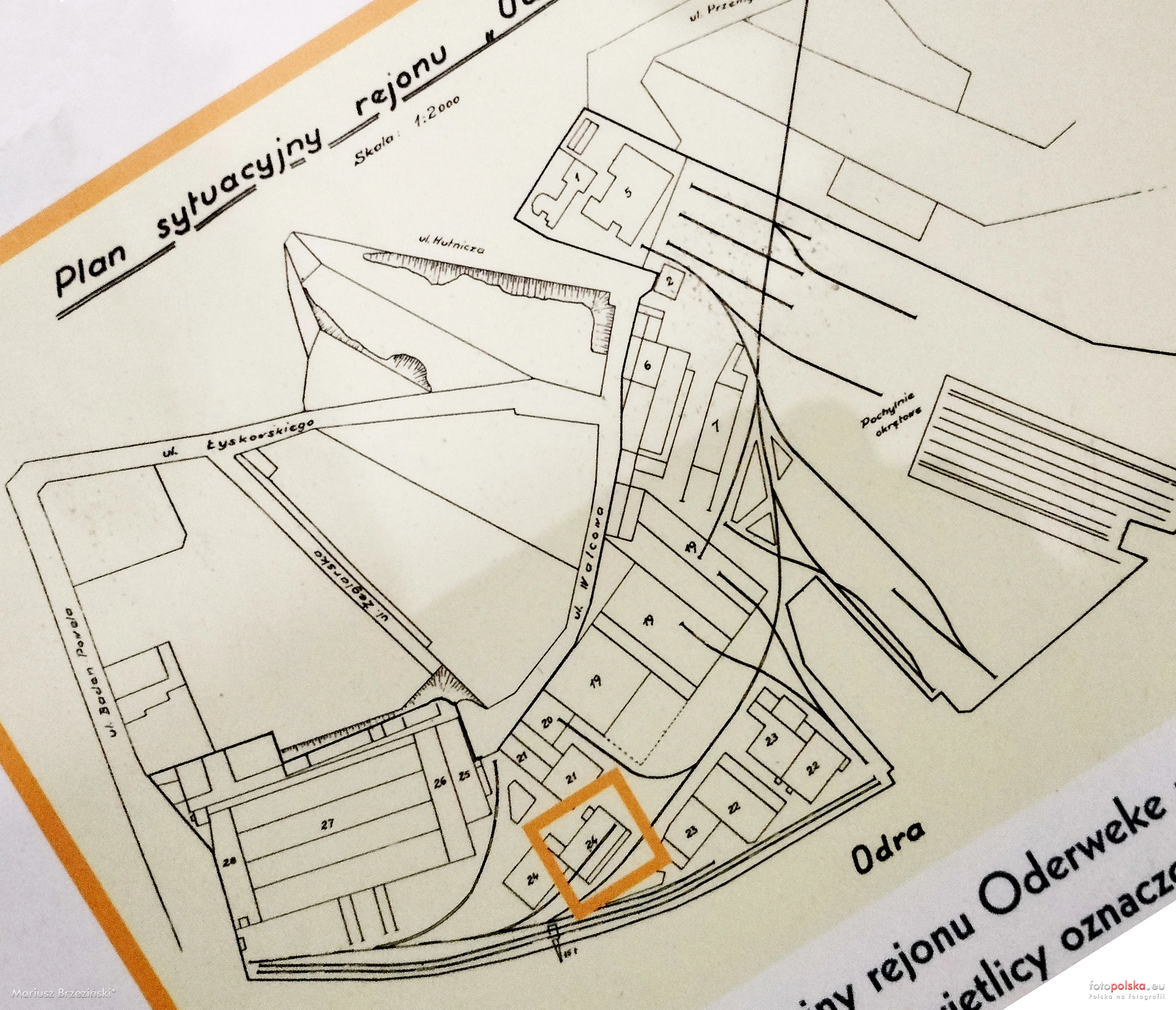 Lata 1948-1952 , Stocznia Szczecińska. Plan regionu "Oderwerke" na wystawie Centrum Solidarności. Zasięg ówczesnej ulicy Walcowej. Numeracja budynków odmienna od dzisiejszej. Kolorowy kwadrat pokazuje miejsce budynku świetlicy zakładowej.Skomentuj zdjęcie |