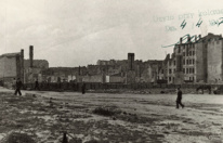 maj 1946 , Pozostałości jednego z wybudowanych podczas wojny baraków na terenie placu postojowego na krótko przed rozbiórką. Rozbiórka miała miejsce między 24 a 25 maja. Widok pozostałości w dniu 1 maja:Skomentuj zdjęcie |