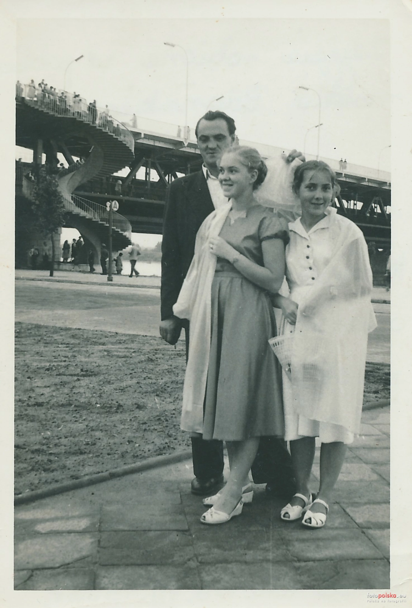 Kilka dni po otwarciu mostu. Tabuny ludzi przyjeżdżały aby przejść się po kręconych schodach. Dodatkową atrakcją był tramwaj pod jezdnią.