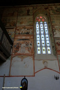 24 maja 2025 , Wnętrze kościoła św. Jakuba, wzniesionego prawdopodobnie przed rokiem 1250. Na zdjęciu spojrzenie na północną ścianę nawy z freskami powstałymi w l. 1475-1483. Malowidła stanowią Biblię Ubogich czyli ciąg wydarzeń ze Starego i Nowego Testamentu. Niestety wiele scen zostało przez lata przemalowanych. W 1817 r. całość dekoracji pokryto tynkiem, który został zdjęty dopiero w 2 pol. XX w., na skutek wilgoci malowidła w dolnych partiach ścian uległy bezpowrotnemu zniszczeniu.