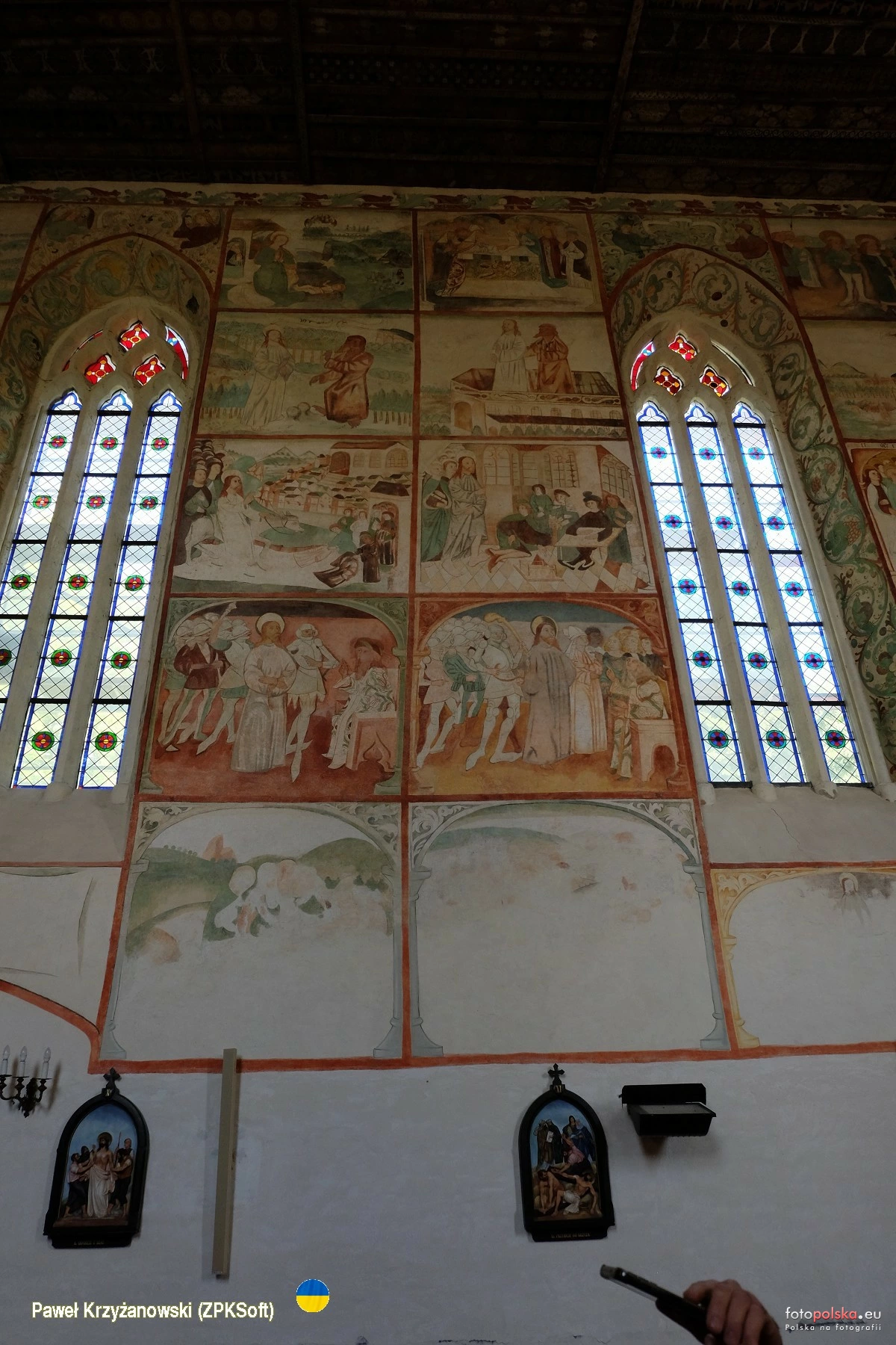 24 maja 2025 , Wnętrze kościoła św. Jakuba, wzniesionego prawdopodobnie przed rokiem 1250. Na zdjęciu spojrzenie na północną ścianę nawy z freskami powstałymi w l. 1475-1483. Malowidła stanowią Biblię Ubogich czyli ciąg wydarzeń ze Starego i Nowego Testamentu. Niestety wiele scen zostało przez lata przemalowanych. W 1817 r. całość dekoracji pokryto tynkiem, który został zdjęty dopiero w 2 pol. XX w., na skutek wilgoci malowidła w dolnych partiach ścian uległy bezpowrotnemu zniszczeniu.