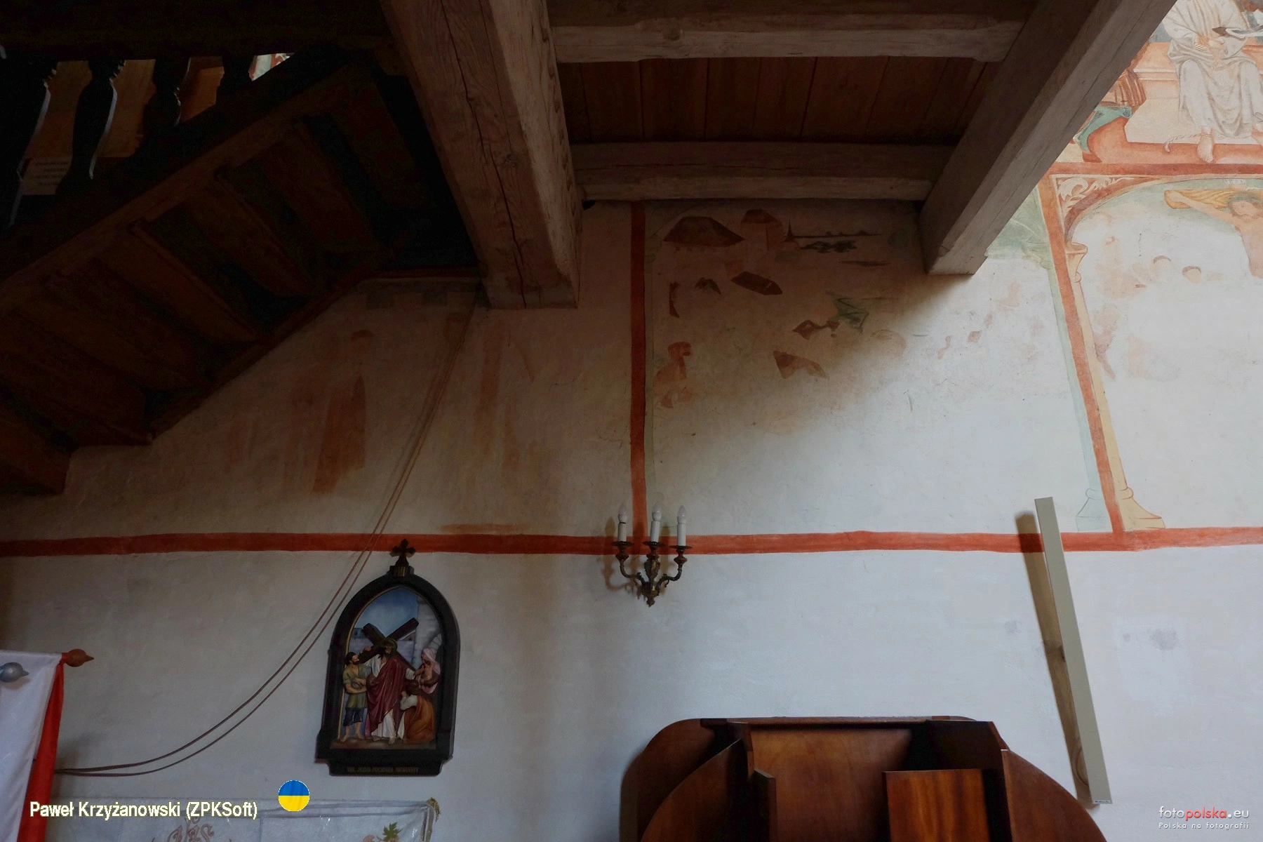Z lat 1450-1460 pochodzą polichromie tzw. drugiego okresu, umieszczone na ścianach prezbiterium, które powstały po zmianach stropu nawy na płaski i naprawach zniszczeń kościoła. Zniszczenia spowodowane najazdem husytów, zmieniły poprzednie pseudo sklepienie drewniane.