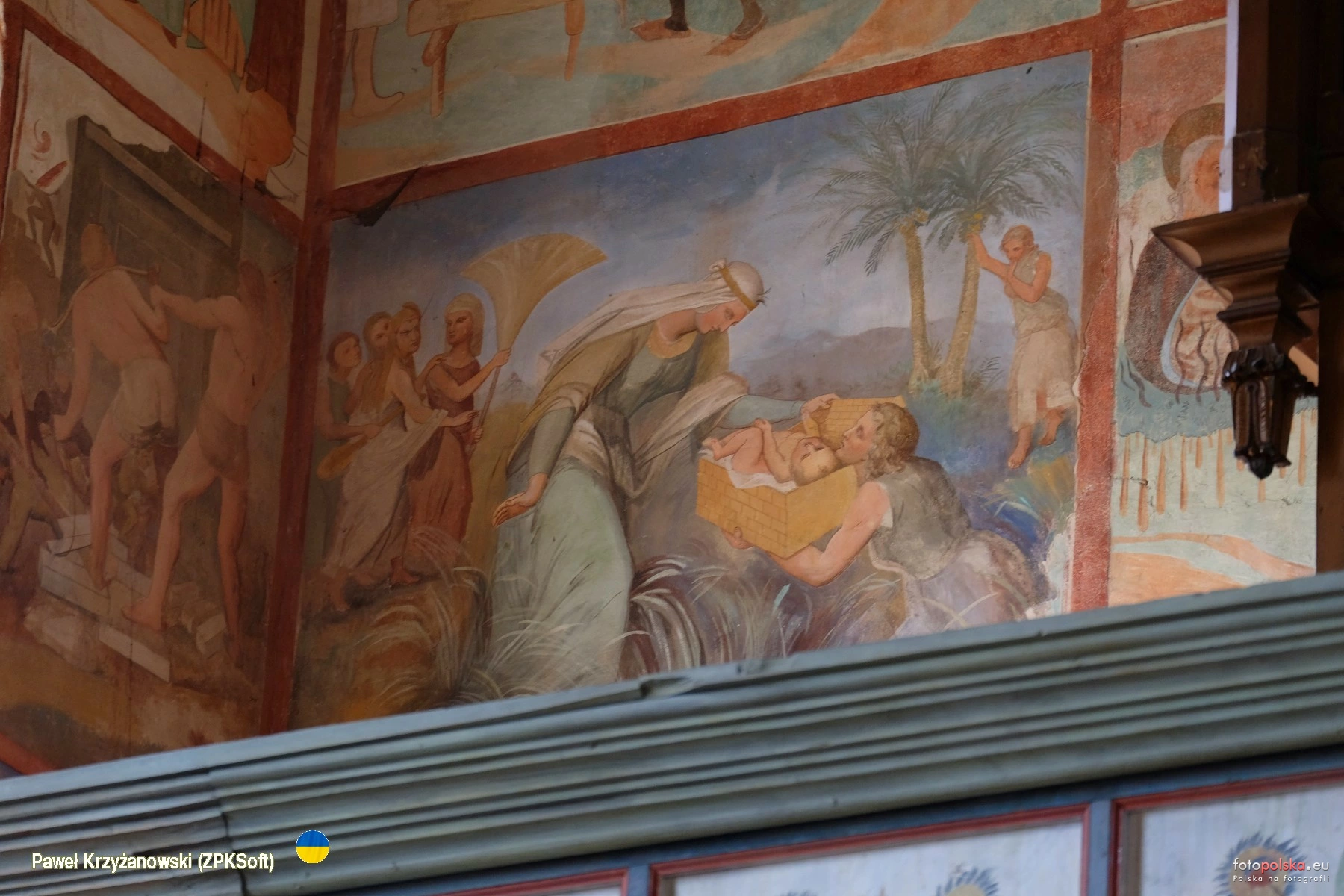24 maja 2025 , Wnętrze kościoła św. Jakuba, wzniesionego prawdopodobnie przed rokiem 1250. Na zdjęciu spojrzenie na zachodnią ścianę nawy z freskami powstałymi w l. 1475-1483. Nad chórem mamy scenę odnalezienia maleńkiego Mojżesza przez córkę faraona. Malowidła stanowią Biblię Ubogich czyli ciąg wydarzeń ze Starego i Nowego Testamentu. Niestety wiele scen zostało przez lata przemalowanych. W 1817 r. całość dekoracji pokryto tynkiem, który został zdjęty dopiero w 2 poł. XX w., na skutek wilgoci malowidła w dolnych partiach ścian uległy bezpowrotnemu zniszczeniu.