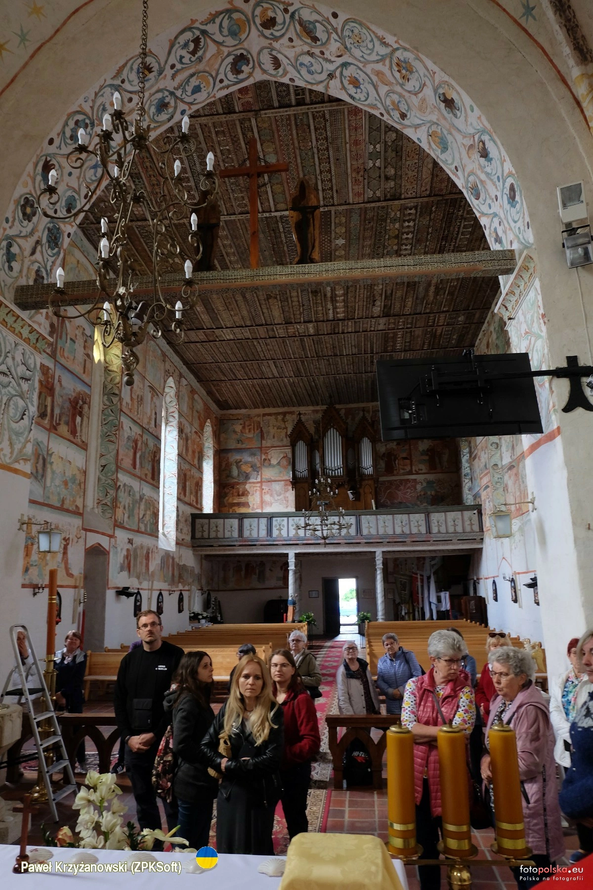 24 maja 2025 , Wnętrze kościoła św. Jakuba, wzniesionego prawdopodobnie przed rokiem 1250. Na zdjęciu spojrzenie z nawy w kierunku chóru z 1717 r. z organami z końca XIX w. Polichromie, którymi pokryte są wszystkie ściany świątyni robią niesamowite wrażenie.