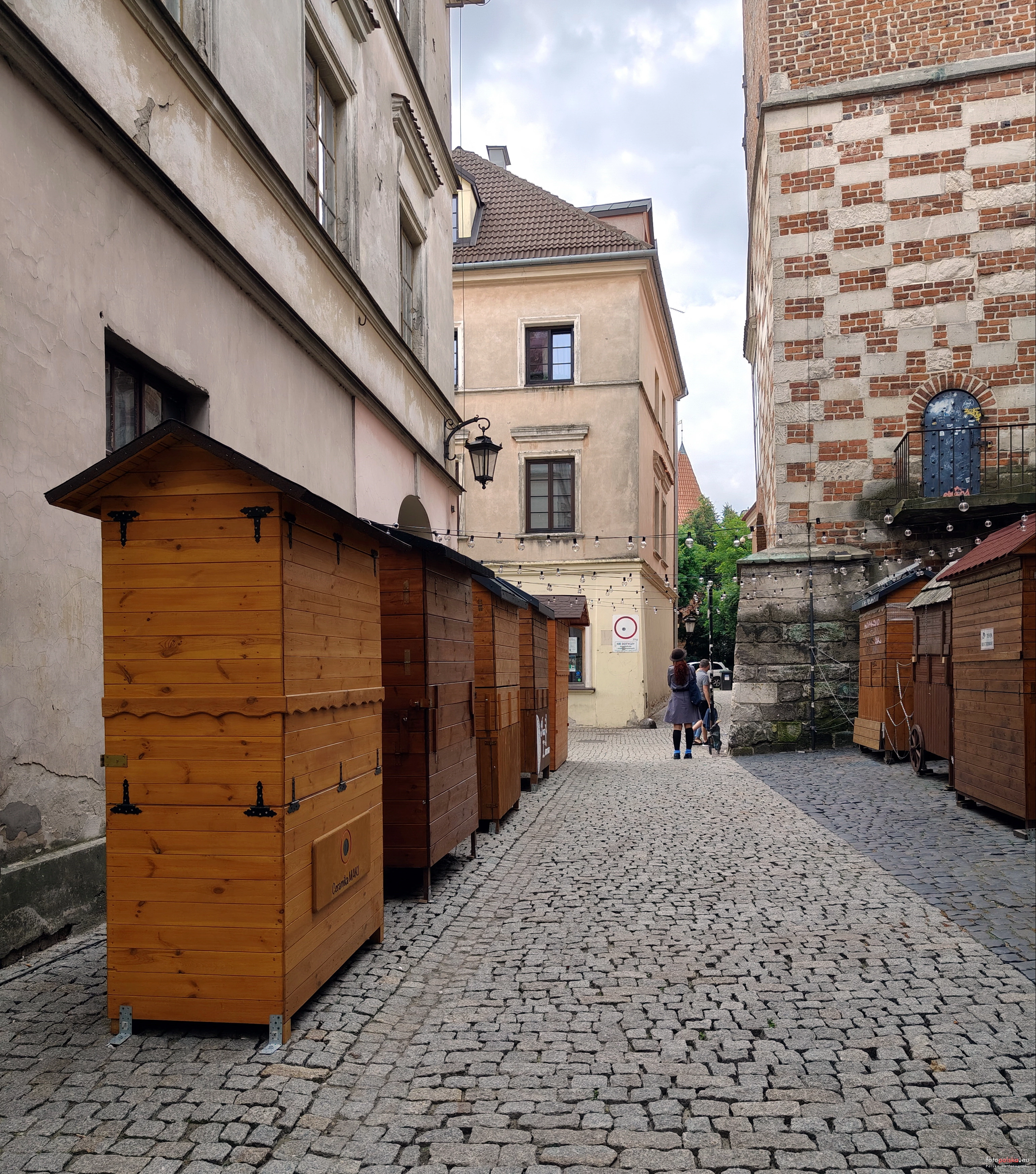 22 czerwca 2025 , Ulica Szambelańska w Dzielnicy Stare Miasto w kierunku ul. Bramowej. Stragany handlowe wykorzystywane w czasie imprez i festynów miejskich.Skomentuj zdjęcie |