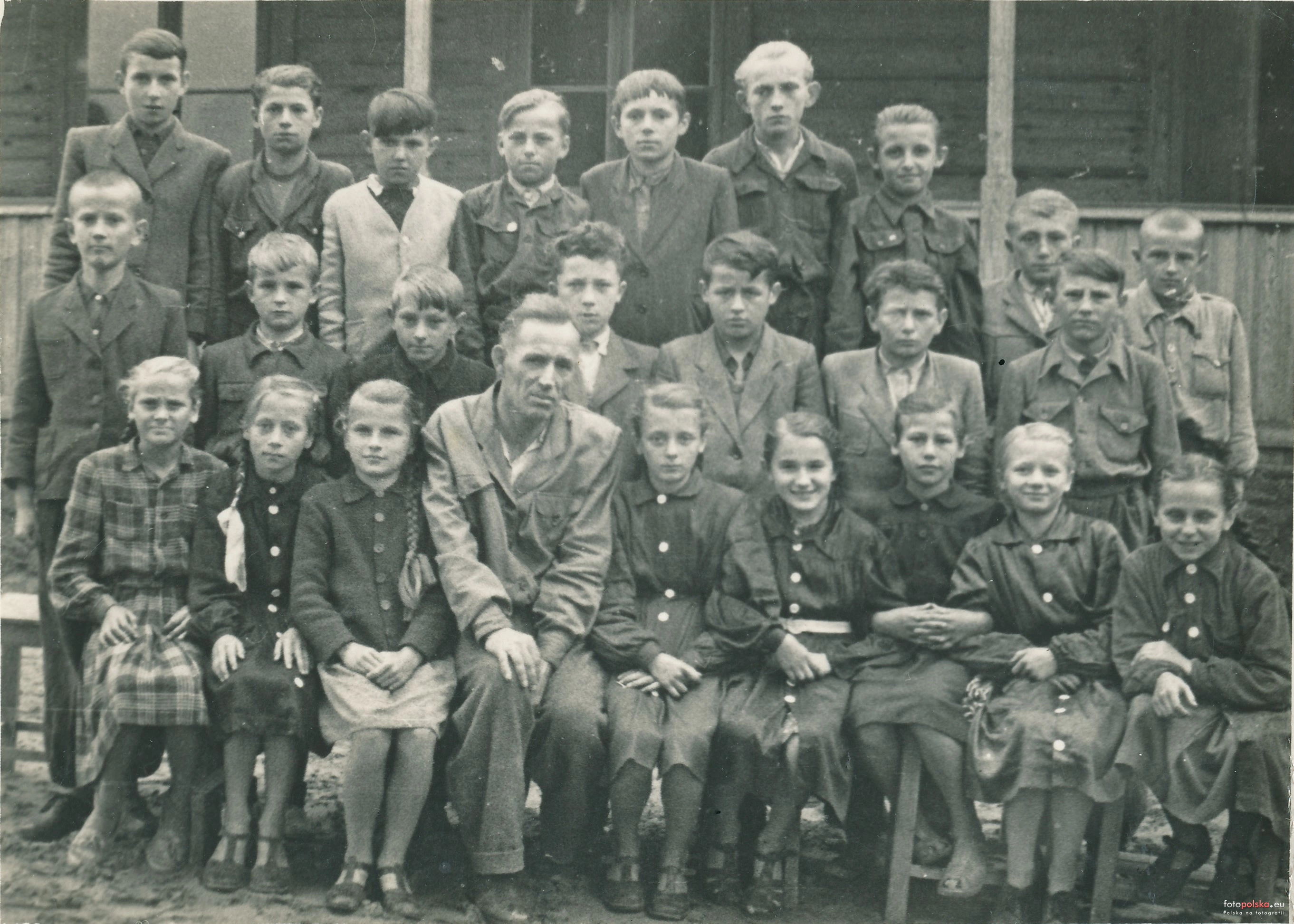 Lata 1945-1965 , Uczniowie szkoły i dyrektor Franciszek Wróbel przed szkołą.Skomentuj zdjęcie