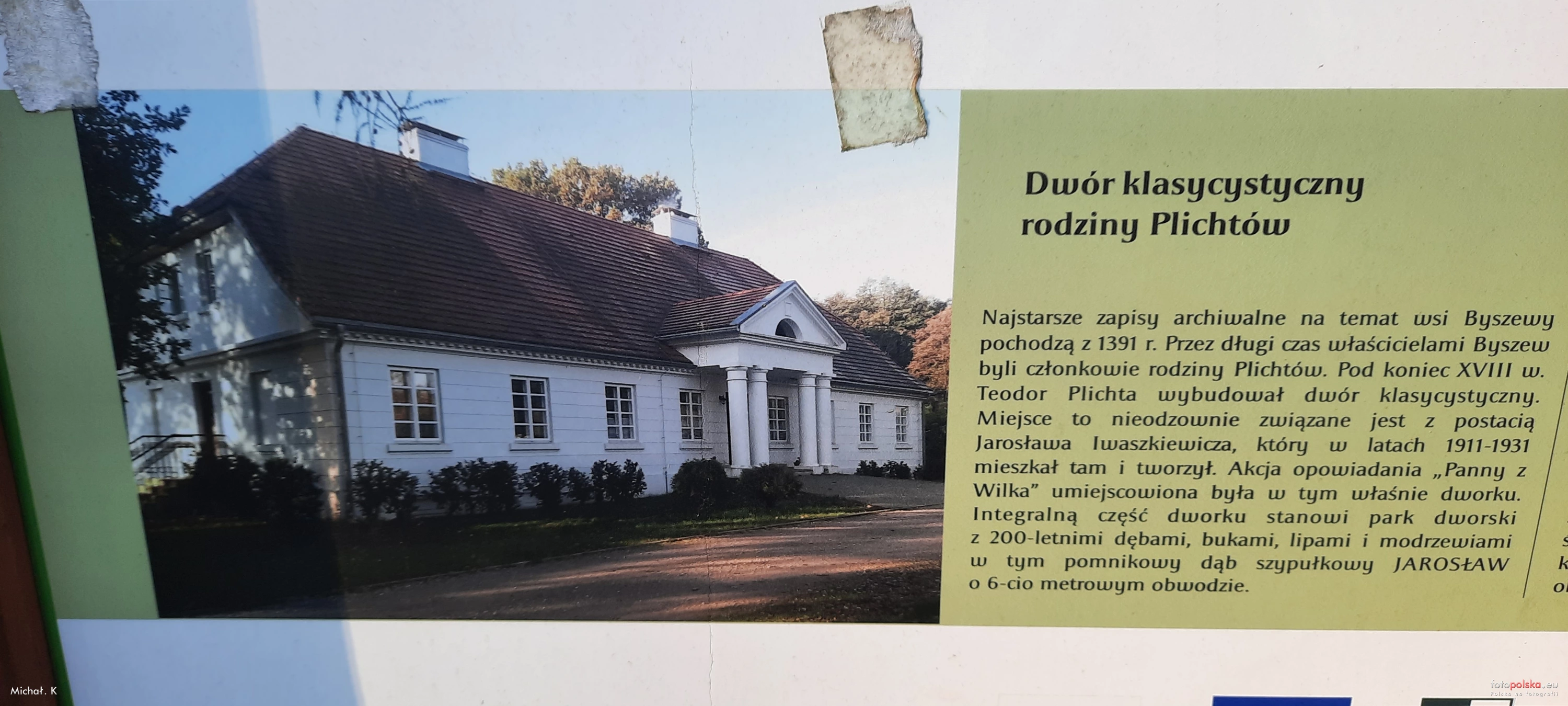 0 pobrań 274 odsłony 0 średnia ocen Poprzednie i następne zdjęcia Michał. K Obiekty widoczne na zdjęciu Dwór więcej zdjęć (16) Atrakcja turystyczna Zabytek: A/370/133 z 27.05.1967 Klasycystyczny dwór wzniesiony przez Teodora Plichtę w końcu XVIII lub na początku XIX wieku (z kolei wg rejestru zabytków pochodzi on z początku XX wieku). Został on wybudowany na planie wydłużonego czworokąta, z gankiem wspartym na czterech kolumnach i dachem krytym gontem. Po II wojnie światowej we dworze mieściły się (doprowadzając go do ruiny) kolejno: szkoła, Urząd Bezpieczeństwa oraz biura PGR. W latach 1978-1982 dwór przeszedł generalny remont. Dach i wnętrze zabytku (w tym meble) spłonęły w czasie pożaru, który wybuchł 26 stycznia 2009 r. W lipcu 2010 Agencja Nieruchomości Rolnych Filia w Łodzi otrzymała 70 tys. zł dotacji z budżetu Województwa Łódzkiego na prace konserwatorskie, restauratorskie oraz roboty budowlane, które zrealizowane zostały w 2011 roku. Sylwetka dworu została umieszczona w logo Parku Krajobrazowego Wzniesień Łódzkich. Dwór jest silnie związany z postacią Jarosława Iwaszkiewicza, który przebywał tam w latach 1911-1913 najpierw jako korepetytor Józefa Świerczyńskiego, potem (wielokrotnie, aż do 1931) jako przyjaciel domu. Pisarz wielokrotnie, z wielkim sentymentem wracał w swojej twórczości do dworu w Byszewach oraz doliny Moszczenicy. "Dwór z czterema kolumnami", jak przyznaje sam autor, stał się miejscem akcji najbardziej znanego jego opowiadania pt. "Panny z Wilka". Osobne rozdziały Iwaszkiewicz poświęcił Byszewom w książkach autobiograficznych: "Podróże do Polski" i "Książka moich wspomnień" oraz opowiadaniu "Ogrody". Wyraźne motywy byszewskie da się odnaleźć też w wierszu "Czerwiec: Pławienie koni" należącym do cyklu "Krągły rok". Wokół dworu znajduje się (obecnie zaniedbany) park podworski o powierzchni 2,3 ha, w którym zachowało się kilka 200-letnich dębów, lip, buków i modrzewi. Najokazalszym drzewem w parku jest prawie całkowicie spróchniały dąb "Jarosław" o ponad sześciometrowym obwodzie. W południowej części parku zachowało się wzniesienie nazywane przez Iwaszkiewicza "Świątynią dumania". Źródło: Autorzy: Licencja: [ CC-BY-SA 3.0] |