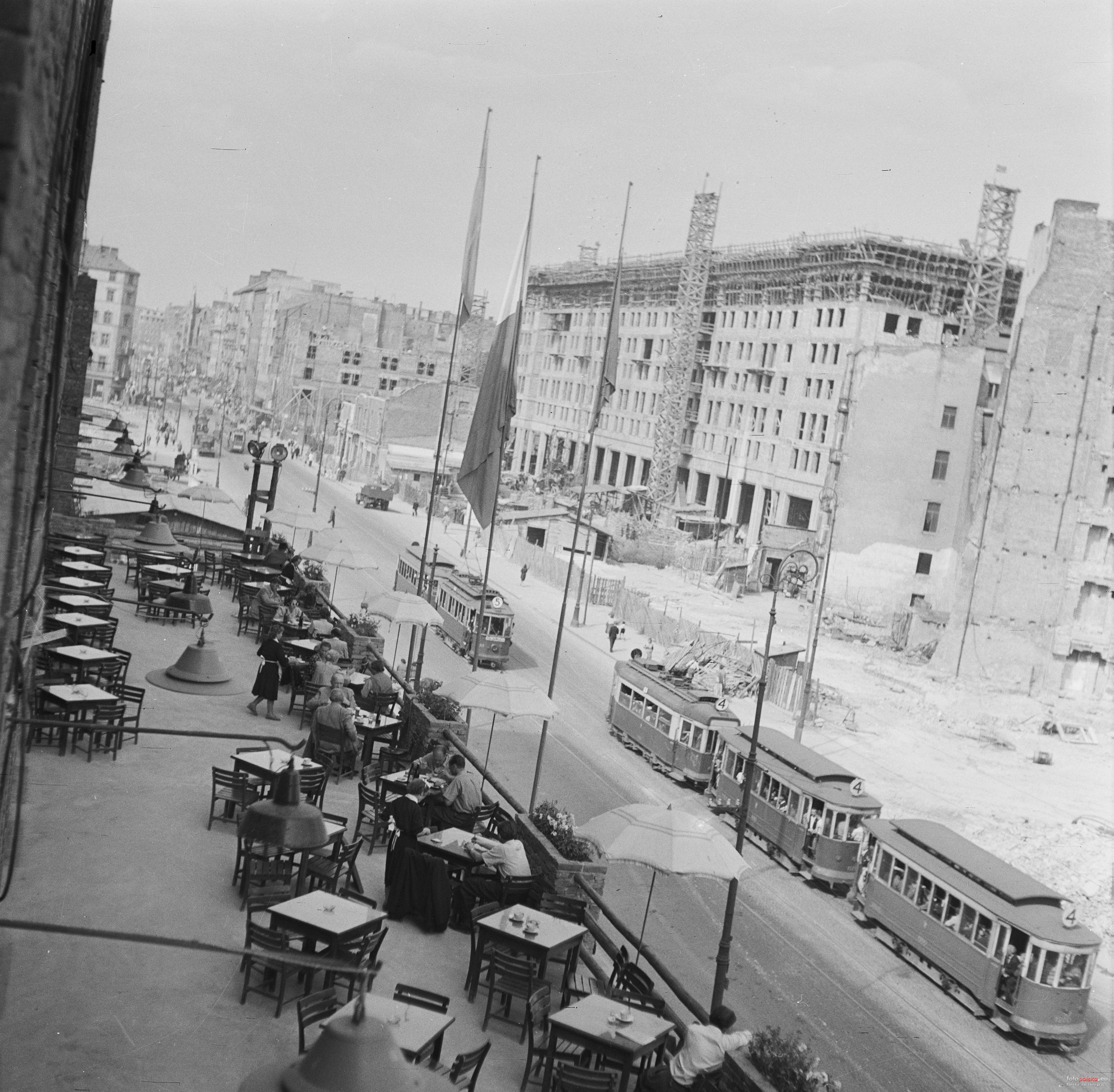 4 pobrania 286 odsłon 6 średnia ocen Poprzednie i następne zdjęcia Desperado Obiekty widoczne na zdjęciu Marszałkowska 45/49 więcej zdjęć (45) Zbudowano: l. 1950-57 Zabytek: 340 z 27-04-2015 ul. Marszałkowska więcej zdjęć (6873) Nazwa ulicy pochodzi od nazwy urzędu marszałka wielkiego koronnego Franciszka Bielińskiego[1], który bardzo zasłużył się osiemnastowiecznej Warszawie, a którego pałac stał przy historycznym początku ulicy, skrzyżowaniu z ul. Królewską. Fragment przy Ogrodzie Saskim przeprowadzono dopiero w okresie międzywojennym. Towarzyszyły temu duże protesty mieszkańców przeciwnych zmniejszaniu powierzchni parku, m.in. dlatego Marszałkowska w tym miejscu jest wygięta w łuk. Wytyczenie ulicy związane jest z powstaniem w latach 1766–1779 Osi Stanisławowskiej, wielkiego założenia urbanistyczno-ogrodowego Warszawy autorstwa króla Stanisława Augusta Poniatowskiego, Jana Chrystiana Szucha i Fryderyka Augusta Moszyńskiego. Centrum miasta przeniosło się w okolice Marszałkowskiej z dwóch ważnych przyczyn, przede wszystkim z powodu budowy w latach 1844-1845 Dworca Wiedeńskiego przy skrzyżowaniu z Al. Jerozolimskimi. Drugą ważną kwestią była też budowa Cytadeli, po północnej stronie ówczesnego centrum, co wymusiło rozwój miasta w kierunku południowo-zachodnim. W drugiej połowie dziewiętnastego wieku, i początku dwudziestego ulica została prawie w całości zabudowana kilkupiętrowymi kamienicami, często bardzo okazałymi. Mieściło się tu wiele sklepów, restauracji, i innych punktów usługowych (w latach 30. XX wieku kilkanaście kin), ulica była bardzo ruchliwa. W latach 1938-1939 pod numerem 134 przy skrzyżowaniu z ul. Świętokrzyską wybudowano modernistyczny gmach Centrali PKO, zniszczony w 1944 podczas powstania warszawskiego. Straty wojenne W czasie drugiej wojny światowej, zabudowa ta została przez Niemców w dużej mierze zniszczona. Dewastacja rozpoczęła się we wrześniu 1939. Szczególnie ucierpiały w wyniku ostrzału artyleryjskiego i bombardowań lotniczych budynki Dworca Kolei Wiedeńskiej i znajdujące się naprzeciwko niego niewielkie kamieniczki Marszałkowska 104 i 106. Zbombardowana została też północna część ulicy, np. kamienica Marszałkowska 149, znajdująca się na rogu Próżnej, czy 153 – na rogu Królewskiej. Ruiny dworca i kilku zbombardowanych kamienic rozebrano jeszcze w czasie okupacji. Największe zniszczenia przyniosło jednak powstanie warszawskie i zniszczenia, a zwłaszcza podpalenia dokonane po nim. Niektóre kamienice, m.in. Pinkusa Lothego (Marszałkowska 100, na rogu Al. Jerozolimskich) i Marszałkowska 50 uległy zniszczeniu w trakcie walk lub bombardowań. Pozostałe gmachy podpalono w trakcie metodycznej dewastacji miasta. Ponadto wojna uniemożliwiła zabudowę narożnika Marszałkowskiej 135 i Świętokrzyskiej 46. Przed wojną mieścił się tam 1-piętrowy domek, który między 1938 a 1939 rozebrano pod nową – nigdy niezrealizowaną – inwestycję. W 1945 straty ulicy szacowano – być może zawyżając je – na 80% substancji. Według serwisu warszawa1939.pl ocalały przede wszystkim najwytrzymalsze kamienice budowane tuż przed wojną: Marszałkowska 8, 18, 56. Ponadto Niemcy nie zniszczyli budynków na południowym krańcu ulicy: 1, 2, 4, 6. Obronną ręką lub z niewielkimi uszkodzeniami wyszły z wojny kamienice Marszałkowska 17, 28/30, 41, 43, 45, 58, 62, 66 i 101 (tzw. willa Marconiego). Pożar zniszczył fasady kamienic 81 i 81a. Dewastacji i wypaleniu uległy gmachy Marszałkowska 47, 69 i 71 (do drugiego piętra), 81b i 83 (do pierwszego piętra), 85 (do drugiego piętra), 95 (do piątego piętra), 124/128 (do drugiego piętra) oraz willa pod nr 141. Ciężko uszkodzony został budynek nr 19 i Kościół Zbawiciela. Stał też całkowicie zrujnowany szkielet Centrali PKO (Marszałkowska 134). Podczas okupacji niemieckiej nazwę zmieniono na "Marschallstrasse". W 1941 niemiecki fotograf Hans Joachim Flessing wykonał w okupowanej ale nie zniszczonej jeszcze całkowicie Warszawie dużą ilość kolorowych fotografii Agfa, które znajdują się aktualnie w niemieckich archiwach państwowych. Znaczna ilość fotografii została wykonana na ul. Marszałkowskiej i stanowi unikalną dokumentację nieistniejących już luksusowych kamienic. Odbudowa Po wojnie w zachowanych parterach zniszczonych budynków uruchomiono liczne sklepy i punkty handlowe m.in. w budynku nr 119 mieściła się kawiarnia Cafe Fogg prowadzona przez Mieczysława Fogga. Ulica zyskała wówczas przydomek „parterowej Marszałkowskiej”. Dużą część fasad wypalonych budynków rozebrano z nakazu Biura Odbudowy Stolicy, nie licząc się z ich rzeczywistym stanem zachowania[2]. Parterowa Marszałkowska powstała głównie dzięki prywatnym funduszom. Jednak dla władz komunistycznych ulica w przedwojennej formie była głównie symbolem kapitalizmu. Ponadto, postanowiono poszerzyć ulicę z przedwojennych 26 do 60 metrów na odcinku między Piękną a Alejami Jerozolimskimi i aż do 140 metrów między Alejami Jerozolimskimi a Królewską. Oznaczało to rozbiórkę wszystkich obiektów pod adresami nieparzystymi wyższymi niż 65, włącznie z zabytkową willą Marconiego. W latach 1952–1954 poczyniono przygotowania pod budowę Pałacu Kultury i Nauki całkowicie zmieniając tym samym charakter tej części miasta. W 1954 poszerzono z kolei odcinek między pl. Konstytucji a Al. Jerozolimskimi. Jedynym przedwojennym budynkiem na tym odcinku ulicy po stronie nieparzystej została oficyna kamienicy nr 81, która dzięki rozbiórce frontu "wysunęła się do przodu". W południowej części wybudowano nowy plac otoczony przez socrealistyczne budynki zwane Marszałkowską Dzielnicą Mieszkaniową. Wymagało to dalszych wyburzeń. Rozebrano zdatny do naprawy gmach nr 47, a cofnięta w głąb posesji kamienica nr 45 została zasłonięta nowym gmachem. Z budynków 43, 60 i 62 