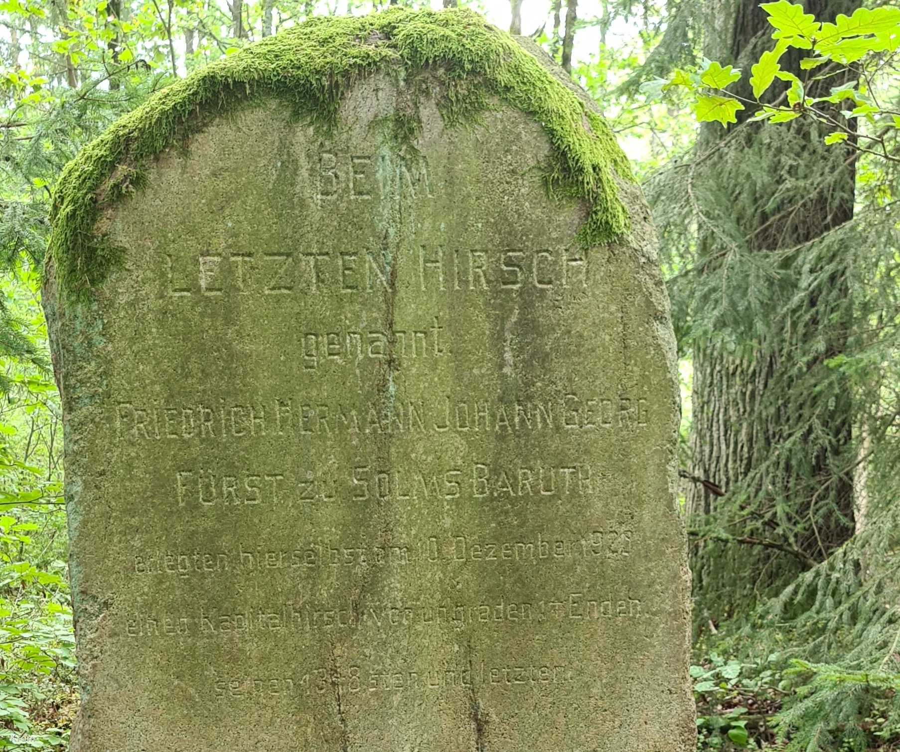 11 września 2024 , Poligon Przejęsław. Pamiątkowy głaz upamiętniający osiągnięcia łowieckie księcia zu Solms. Inskrypcja: "POD OSTATNIM JELENIEM zwany. Friedrich Herman Johann Georg Fürst zu Solms Baruth, 10 grudnia 1929 roku upolował (ubił) tu swego ostatniego z 1348-miu, kapitalnego jelenia o nieparzystych końcach." |
