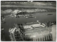 1939 , Kąpielisko nad Odrą Zachodnią oraz boisko przy dzisiejszej ul. Nadbrzeżnej w Szczecinie - Pomorzanach, na zdjęciu lotniczym. Naprzeciw fragment południowej części Wyspy Zielonej z widoczną dawną przystanią przy gospodzie Sonnenblick. Dalej Przekop Parnicki oraz przy górnej krawędzi zdjęcia, zabudowa dzisiejszej ul. Wiejskiej na Wyspie Puckiej.Skomentuj zdjęcie
