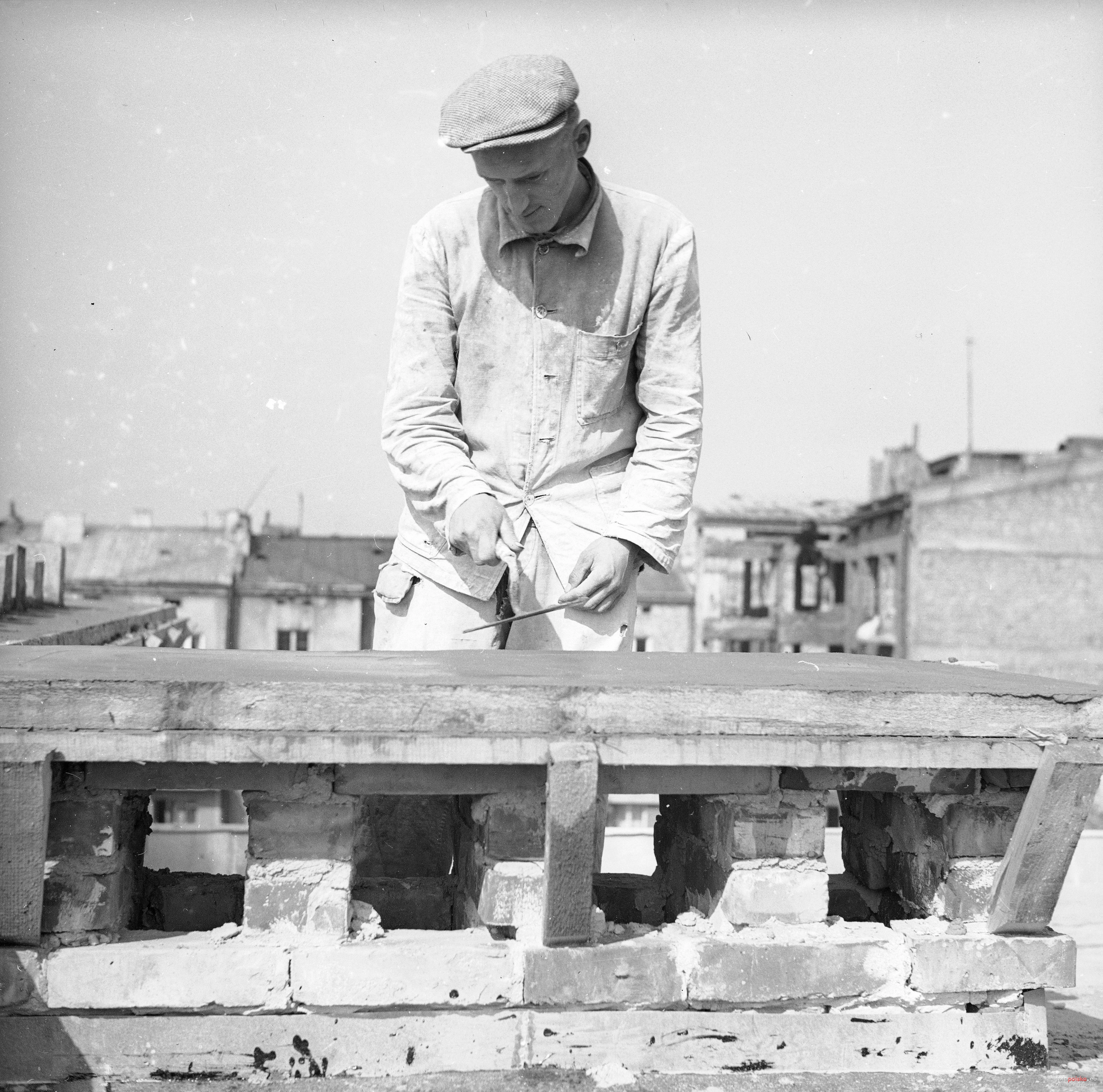 1950 , Żołnierze Ludowego Wojska Polskiego na budowie Wrocławskiego Przedsiębiorstwa Budowlanego.Skomentuj zdjęcie