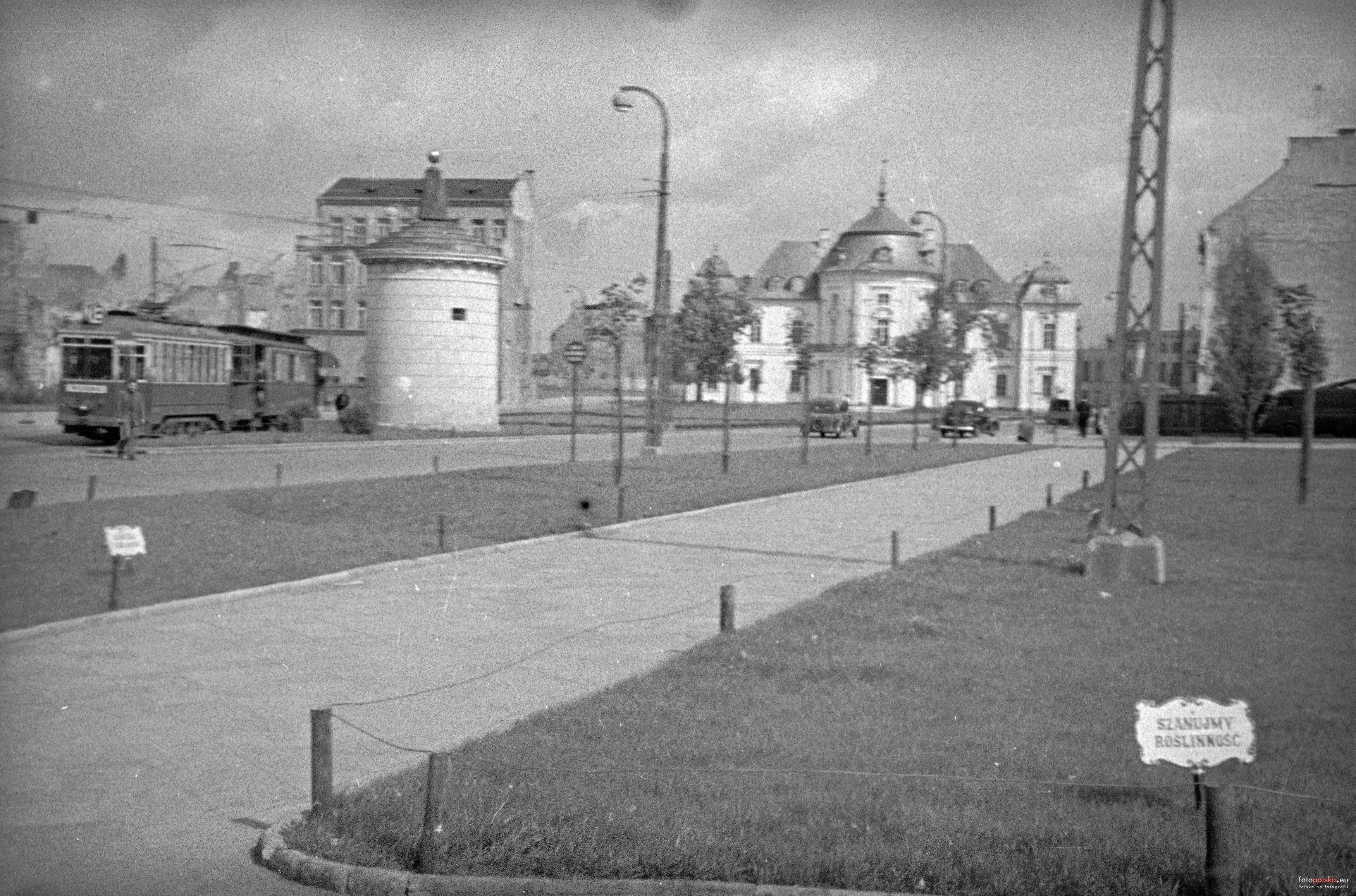 1950 , Gruba Kaśka. W głębi pałac Przebendowskich.Skomentuj zdjęcie |
