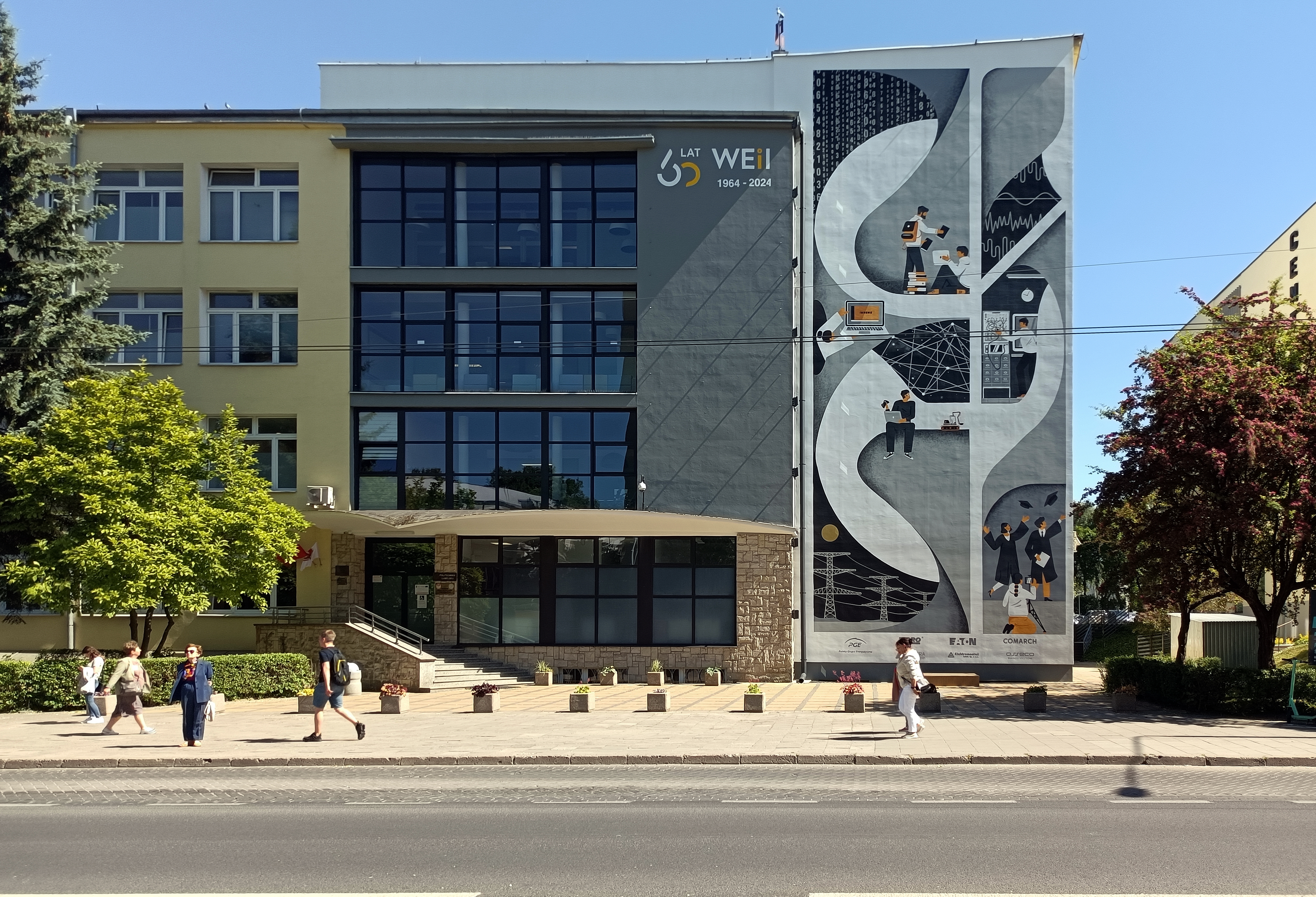 17 maja 2024 , Mural "60 lat WEiI". Mural o wymiarach 8m na 20 m przedstawia drogę, jaką pokonuje student od chwili przyjęcia na uczelnię aż po zdobycie tytułu. Nawiązuje również do wydziału, posiada logo. Autorem projektu jest Dawid Ryski. Odsłonięcie z uroczystą galą odbyło się o godz. 13:00.Skomentuj zdjęcie |