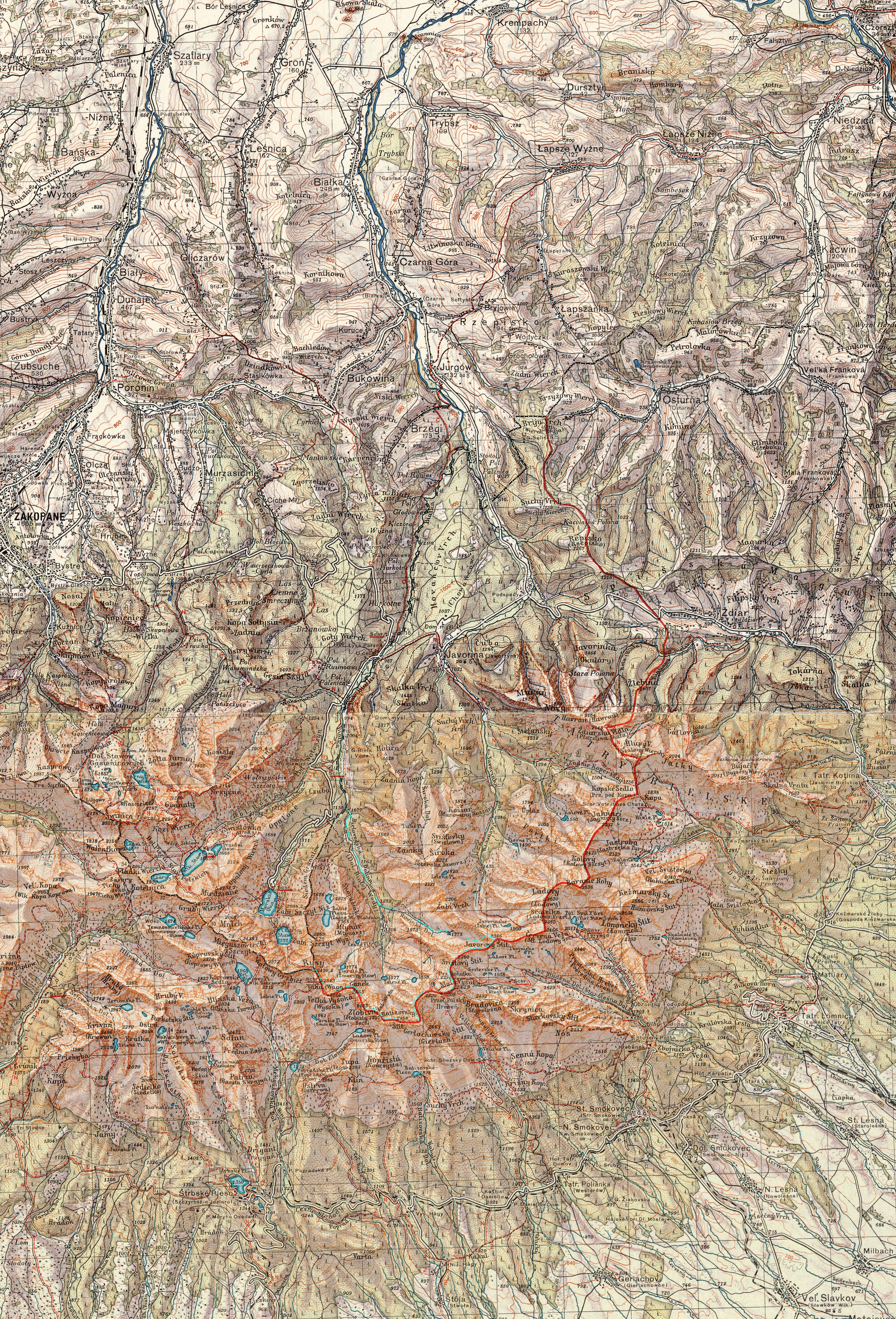 1939 , Mapa złożona z dwóch wycinków arkuszy mapy WIG z zaznaczonym oryginalnie nowym przebiegiem granicy (czerwona gruba linia) polsko-czechosłowackiej po przyłączeniu do Polski Jaworzyny Spiskiej i wschodniej części doliny Białej Wody w Tatrach po 30 listopada 1938 r. |