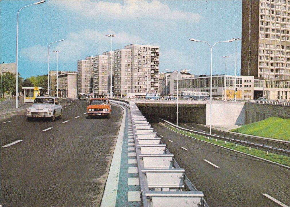 Lata 1974-1975 , Trasa Łazienkowska w pobliżu Riviery. Po lewej nowiutka wiata i podświetlany słupek przystankowy.Skomentuj zdjęcie |