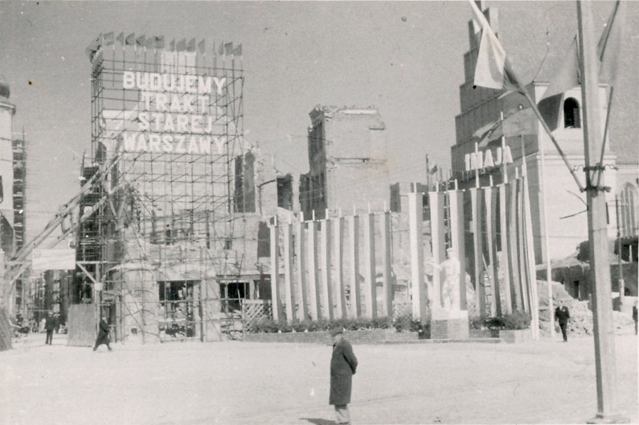 maj 1952 , Plac Zamkowy w początkach odbudowy Starówki i Traktu Królewskiego. Plus okazjonalna rzeźba na 1 Maja.Skomentuj zdjęcie