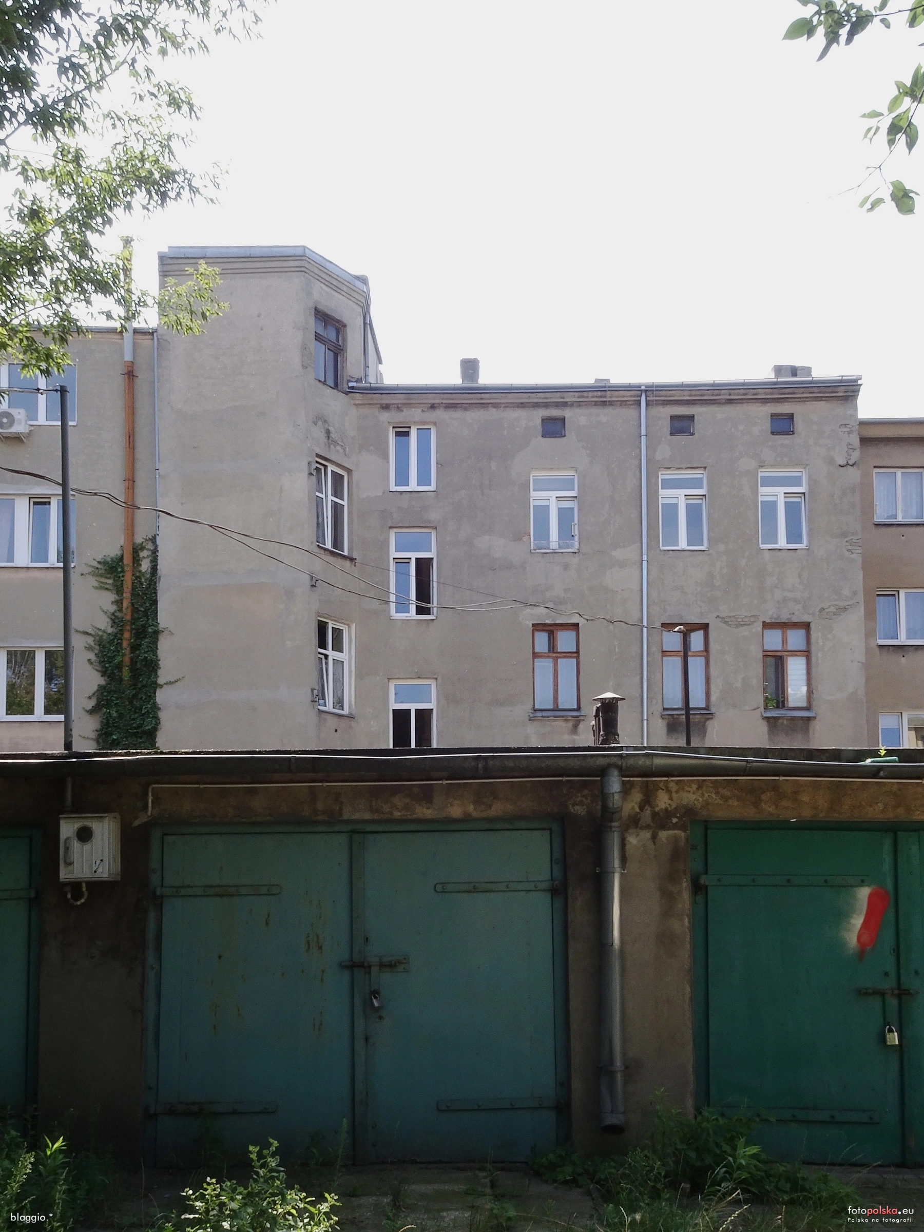 10 sierpnia 2025 , Tył kamienicy Podrzeczna 23 - widok ponad dachem garaży z terenu przy bloku mieszkalnym Drewnowska 14 |