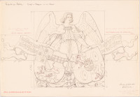 Anioł i herby nad portalem, z wymiarami. Rysunek odręczny: tusz indyjski, ołówek, tusz kolorowy na papierze 50,9 x 73,1 cm.