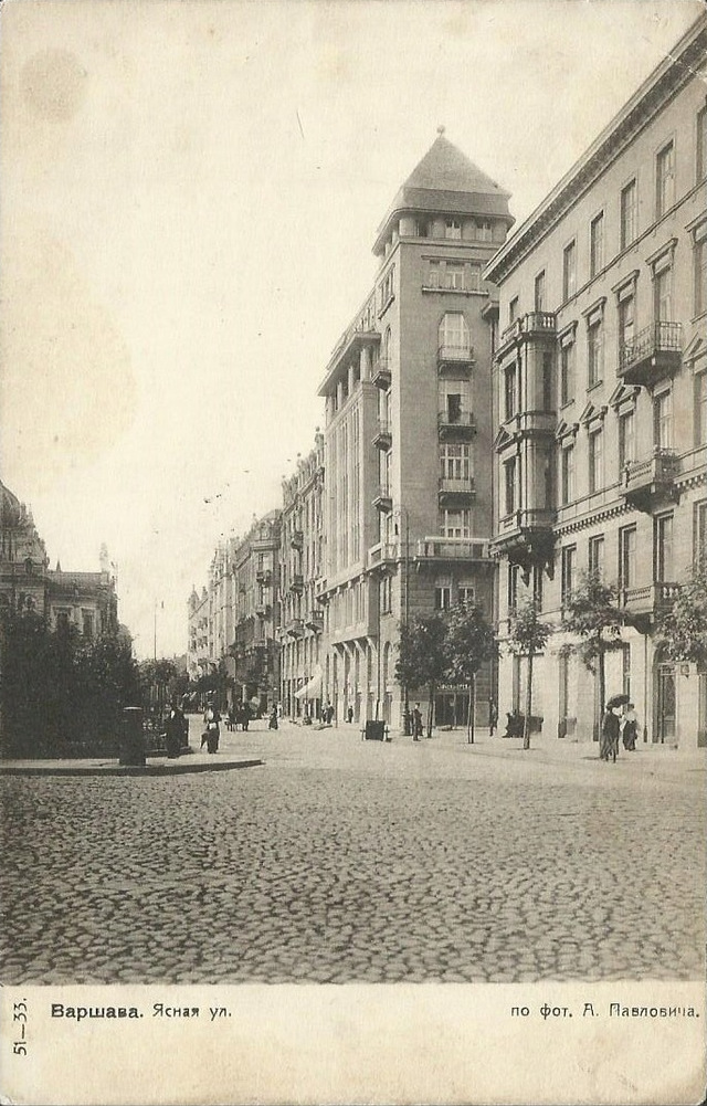 1 pobranie 161 odsłon 6 średnia ocen Poprzednie i następne zdjęcia verbensis Obiekty widoczne na zdjęciu ul. Jasna więcej zdjęć (428) Ulica Jasna – jedna z ulic ścisłego centrum Warszawy, biegnąca od zbiegu ulic Zgoda, Przeskok i Złotej do Pl. Dąbrowskiego. Jasna powstała w roku 1757 jako jedna z ulic jurydyki Bielino; wytyczono ją na osi pałacu marszałka Franciszka Bielińskiego przy ul. Królewskiej. Jasna sięgała wtedy tylko do ul. Świętokrzyskiej; po jej zachodniej stronie wytyczono szereg parcel sięgających aż do ul. Szkolnej, z których powstał działki przypisane do obu ulic. Przeciwna strona Jasnej tworzyła w tym czasie wschodnią pierzeję rynku jurydyki Bielino, z którego powstał z czasem Plac Zielony, dzisiejszy Pl. Dąbrowskiego. Na wytyczonych parcelach pobudowano dworki według projektu Jakuba Fontany; w pierwszym okresie istnienia Bielina wyróżniał się jego autorstwa wielki dwór pod nr. 11/13, istniejący do roku 1944. Pozostałe budynki z tego okresu były znacznie skromniejsze: murowane dworki wznoszono nierzadko wraz z drewnianymi oficynami. Mieszkańcami Bielina i ulicy Jasnej w duże mierze byli rzemieślnicy i kupcy wyznania ewangelickiego, przybyli tu z Niemiec. Magnesem który ich przyciągnął były przywileje ekonomiczne: ceny zbywanych przez nich towarów mogły być niższe niż w Starej Warszawie, i przez to konkurencyjne. Dobrą passę przerwało zlikwidowanie przez władze Pruskie jurydyki w roku 1796; Jasna podupadła, stając się na kilka lat nudną uliczką. Przełom nastąpił dopiero po wybudowaniu w latach 1844-45 dworca kolei Warszawsko-Wiedeńskiej; zapoczątkowało to nowy rozdział w dziejach całej okolicy ul. Marszałkowskiej, w tym Placu Zielonego i ulicy Jasnej. Bliskie sąsiedztwo dworca a zarazem zaciszność sprawiły, że Jasna stała się atrakcyjnym miejscem do wznoszenia hoteli i kamienic czynszowych. Jako pierwszy powstał dwupiętrowy dom Ciszewskiego pod nr. 22, wzmiankowany w roku 1844; niedługo potem dwie wielkie posesje przy Jasnej nabył architekt Piotr Frydrych. Wkrótce rozparcelował mniejszą z nich na kolejne działki, z których jedną nabył znany architekt Julian Ankiewicz, by niedługo potem pod nr. 17 wznieść własną, rodzinną kamienicę. Pozostałą część nabył znany fabrykant cegieł Kazimierz Granzow, i wkrótce wzniósł podobny obiekt, tyle że zwrócony fasadą na Plac Zielony, dziś Plac Jana Henryka Dąbrowskiego. Większą z pozyskanych posesji Frydrych podzielił na cztery mniejsze; do roku 1866 wzniesiono tam pod nr. 26 Hotel Victoria, należący do spółki Mader&Jacobi. Około roku 1893 łazienki Hotelu Victoria ozdobiły malowidła olejne pędzla Wojciecha Gersona. W zbliżonym okresie powstały dwa budynki na dalszych częściach działki Frydrycha; obok w latach 1881-83 według projektu Witolda Lanciego wzniósł swój przyuliczny pałac przemysłowiec Karol Szlenkier. W roku 1922 budynki położone przy Placu Jana Henryka Dąbrowskiego zaliczane dotąd do Jasnej otrzymały odrębną numerację; jednak wielkie zmiany przyniosła dopiero parcelacja terenów Szpitala Dzieciątka Jezus leżących pomiędzy ulicami Świętokrzyską, Zgoda, Marszałkowską i Placem Wareckim (dziś: Plac Powstańców Warszawy). W okresie 1896-1901 wyburzono dawne zabudowania szpitalne, wytyczając na ich miejscu nowe ulice, w tym przedłużenie Jasnej. Pierwszym obiektem wybudowanym przy nowym odcinku ulicy był gmach Filharmonii Warszawskiej, znanej po roku 1955 jako Filharmonia Narodowa. Autor projektu, Karol Kozłowski, nadał siedzibie filharmonii formę eklektycznej, nakrytej efektownym dachem budowli wzorowanej na paryskiej Opery. Po kilku latach walory estetyczne gmachu Filharmonii stały się słabo widoczne z powodu gęstej zabudowy przecznic i braku właściwej perspektywy. Budowę Filharmonii Warszawskiej ukończono w roku 1901; dwa lata później powstała projektowana także przez Kozłowskiego efektowna kamienica pod nr. 2. Również w roku 1903 przeprowadzono rozbiurkę kamienicy Strausów przy ul. Świętokrzyskiej; ów dom przegradzał Jasną, uniemożliwiając dwa lata połączenie jej starego i nowego odcinka. Wkrótce przy Jasnej wzniesiono szereg kamienic o bogatej ornamentyce fasad i wielkich witrynach sklepowych w przyziemiach; ich eklektyczne i secesyjne detale świetnie harmonizowały z gmachem filharmonii; Jasna stała się jedną z najlepiej zabudowanych ulic w mieście. Nowy, południowy odcinek ulicy miał początkowo charakter mieszkaniowy; z czasem jednak zaczęły się lokować przy nim instytucje ubezpieczeniowe i banki, tworząc zaczątek finansowego "city". Również wielopiętrowe kamienice mieszkalne zaczęły z biegiem czasu pełnić rolę biurowców; wynajęte lokale mieszkalne pomieściły przedstawicielstw licznych firm finansowych. Metamorfozę taką przeszła kamienica pod nr. 4, mieszcząca od roku 1913 biura Towarzystwa Ubezpieczeń od Ognia; również pod nr. 6 od roku 1818 miał swą siedzibę Bank Spółek Zarobkowych i Gospodarczych. Naprzeciwko, pod numerem 1, według projektu Jana Heuricha wzniesiono w latach 1912-17 wczesnomodernistyczny gmach Banku Towarzystw Spółdzielczych, znany też jako "Dom pod Orłami" - jedno z najwybitniejszych dzieł architektury polskiej początków XX wieku. Także w roku 1913 ukończono budowę budynku Teatru Nowoczesnego, wzniesionego pod nr. 3 według projektu Czesława Przybylskiego; nowy teatr wraz z Filharmonią Warszawską stworzyły enklawę placówek kulturalnych w śródmieściu miasta. Najpóźniej wzniesionym obiektem stanowiącym o finansowym i wielkomiejskim charakterze okolicy był gmach Pocztowej Kasy Oszczędności, przypisany jednak numeracji ul. Świętokrzyskiej; wzniesiony w roku 1921 według projektu Józefa Handzelewicza, został rozbudowany w roku 1930 na podstawie obliczeń konstrukcyjnych Stefana Bryły. W latach dwudziestych XX wieku przy Jasnej w dalszym ciągu lokowały si