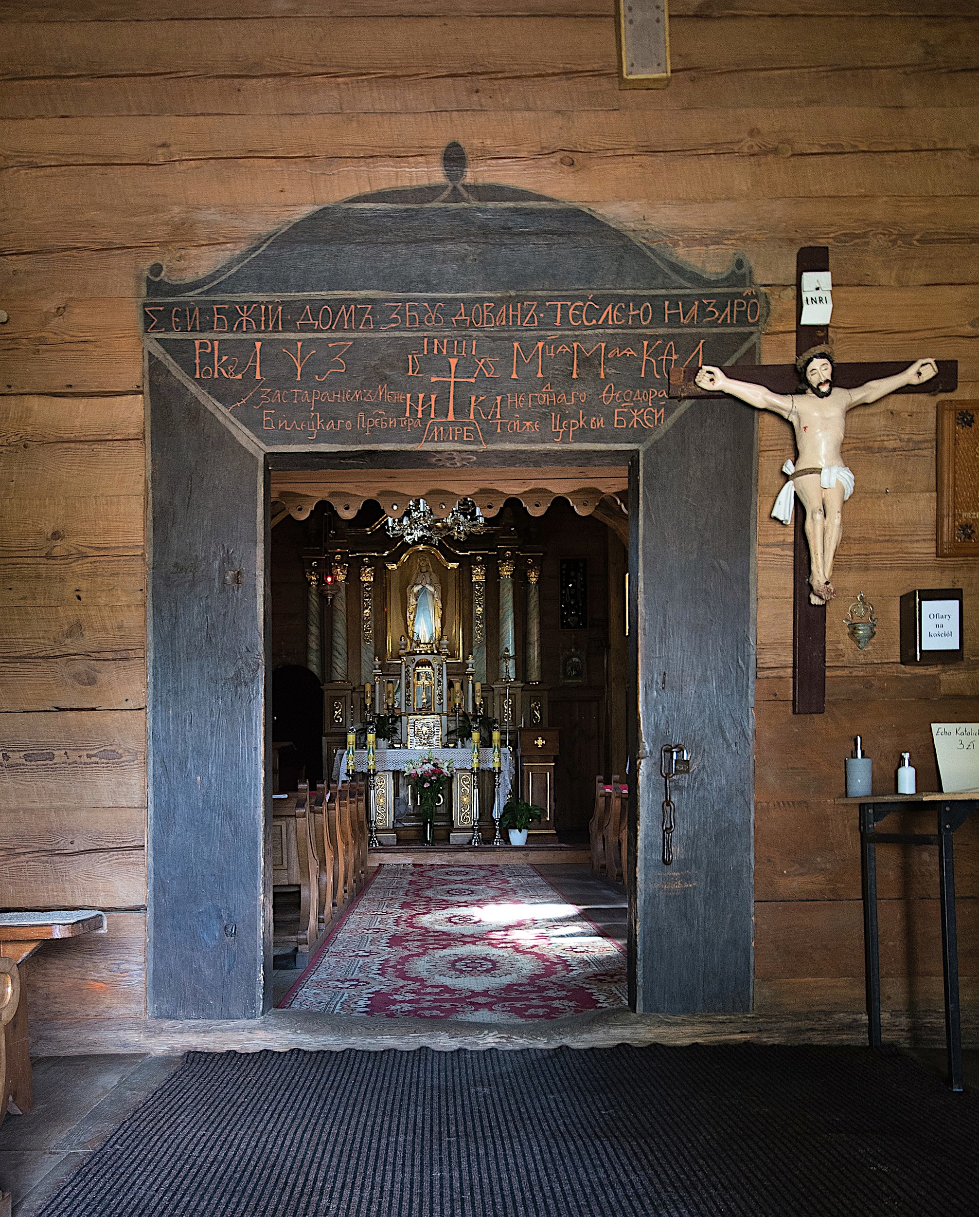 4 września 2023 , Ortel Królewski Pierwszy. Kościół Matki Bożej Różańcowej, dawniej cerkiew unicka. Portal pomiędzy kruchtą i nawą kościoła. Zachował się na nim napis w języku starocerkiewnym: "Ten Boży dom zbudowany został przez cieślę Nazara roku 1707 miesiąca maja 29 za staraniem mnie niegodnego Teodora Bieleckiego prezbitera tegoż kościoła Bożego".Skomentuj zdjęcie |