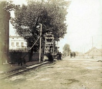 Lata 1899-1900 , Ulica Pabianicka przed widoczną po lewej stronie willą Ferdynanda Koeniga (nr 49) w kierunku północno-wschodnim, wcześniej widoczny skrawek kamienicy czynszowej. Trwa montaż trakcji tramwajowej.Skomentuj zdjęcie |