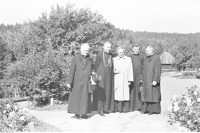 Imieniny ks. Prymasa - goście przed wyjazdem. Widoczni od lewej: ks. biskup Zygmunt Choromański, ks. kard. Stefan Wyszyński, ks. biskup Michał Klepacz, kleryk Włodzimierz Sułek, ks. dr Hieronim Goździewicz.
