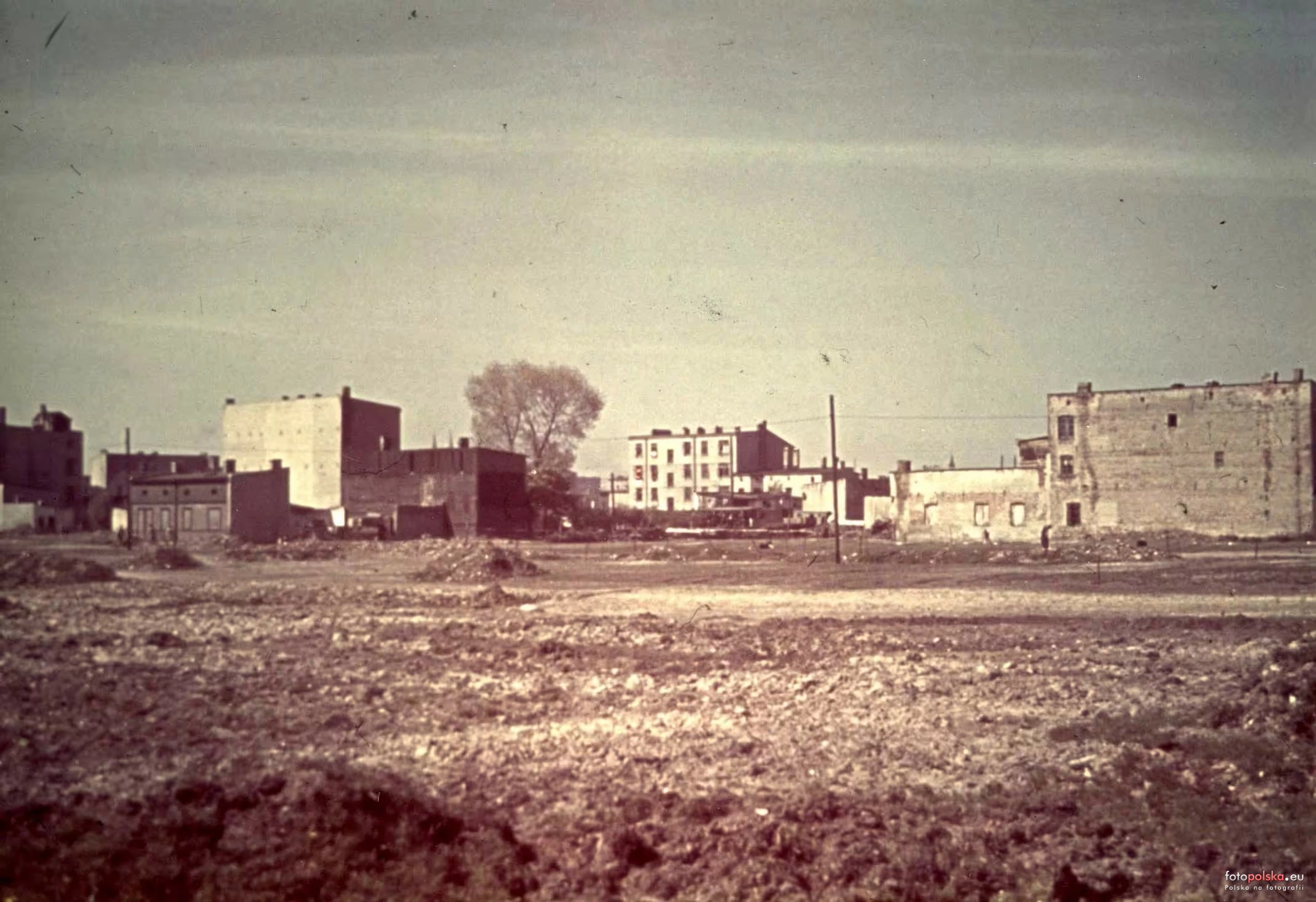 Widok z terenu obecnego parku Szarych Szeregów na budynki między ulicami Marysińską i Marynarską. W centrum zdjęcia tył kamienicy przy ulicy Marynarskiej 55, po lewej tył kamienicy przy ulicy Marysińskiej 51, po prawej tył nieistniejącej już kamienicy przy Marysińskiej 57.