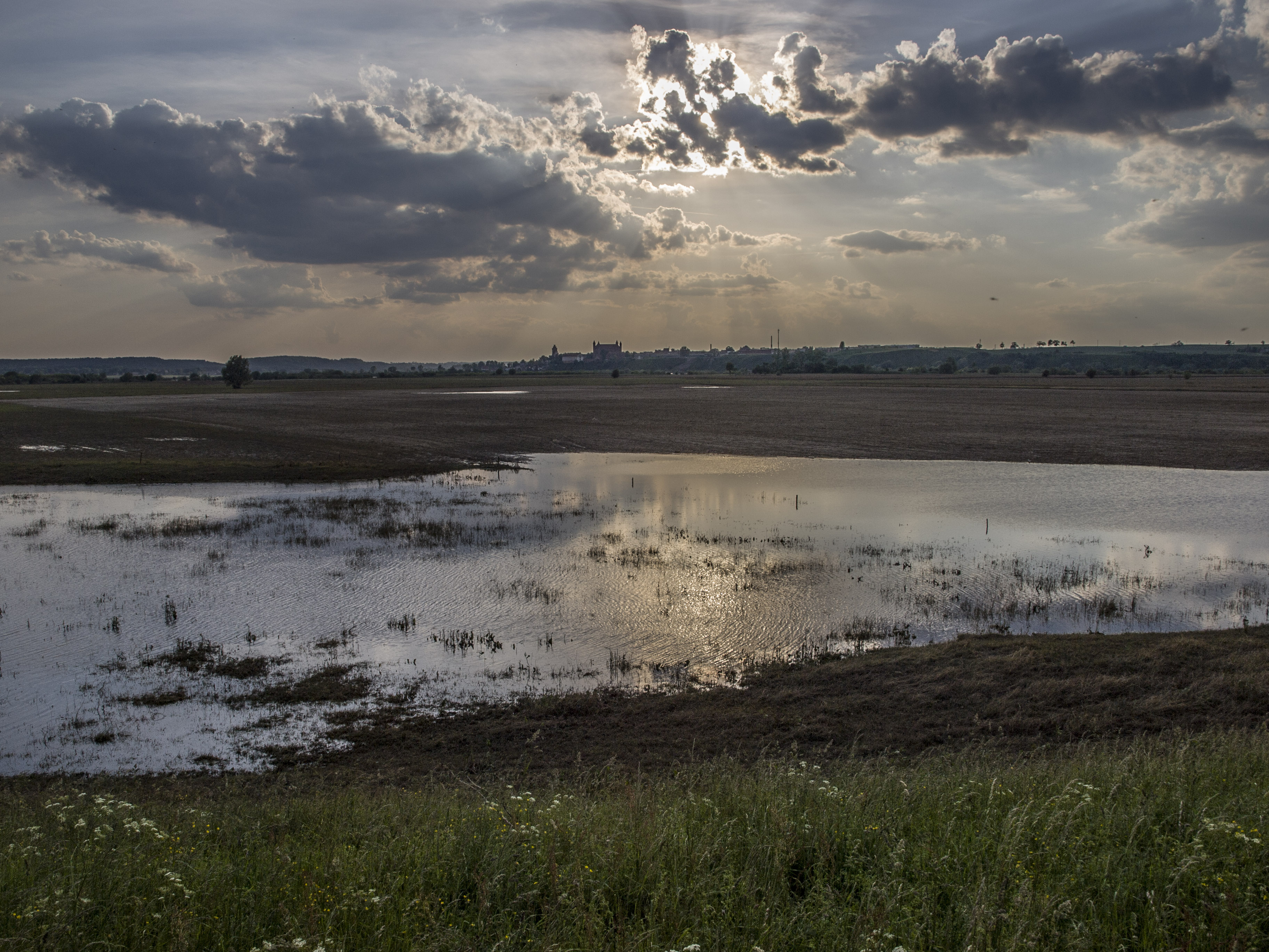 , Widok z wału w kierunku Gniewu o zachodzie słońca.
