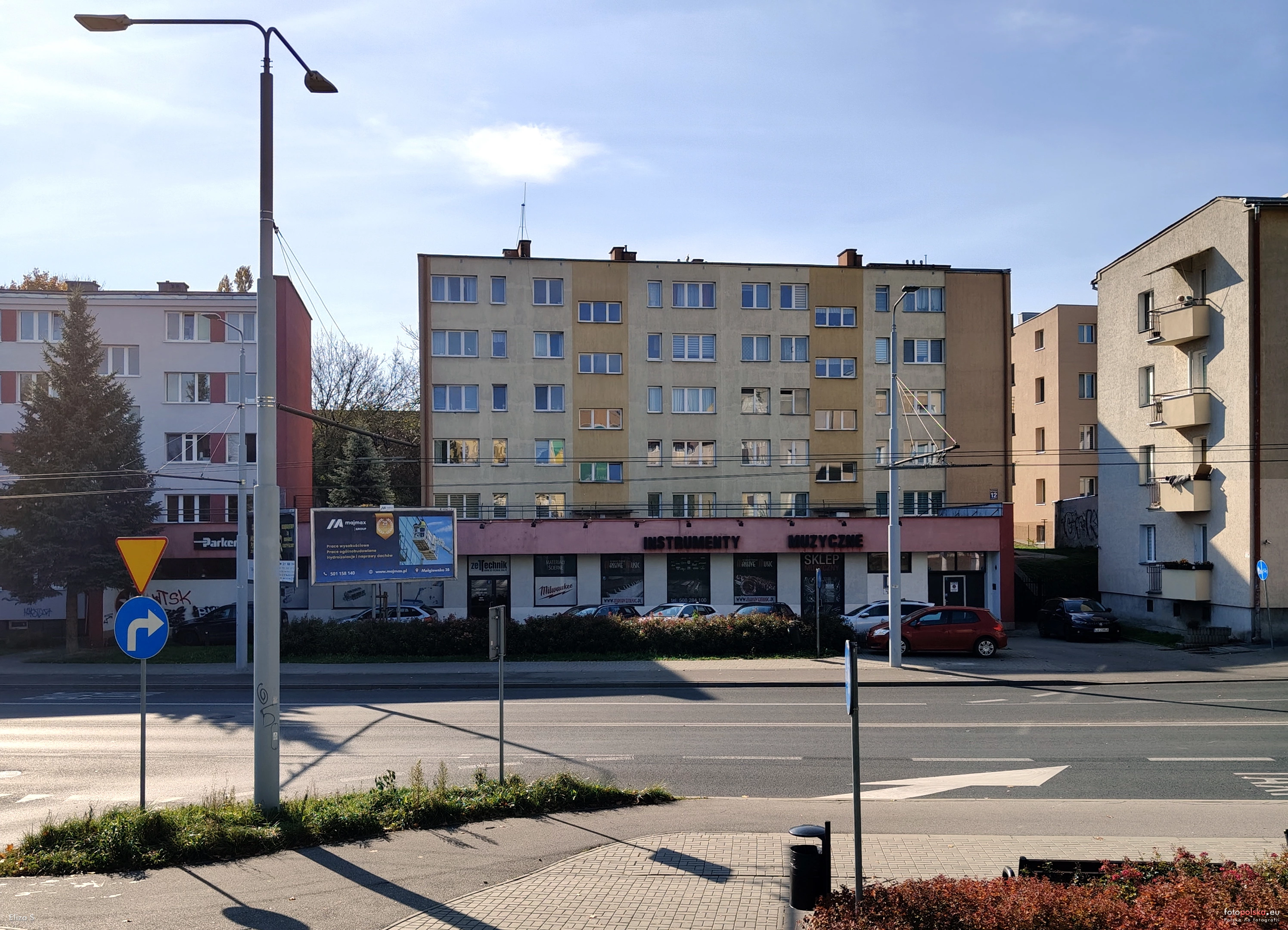 23 października 2025 , Widok z ul. Antoniego Szczerbowskiego na ulicę Muzyczną (poprzeczna). W głębi parterowy pawilon ul. Muzyczna 7 i za nim blok mieszkalny ul. Plażowa 12.Skomentuj zdjęcie |