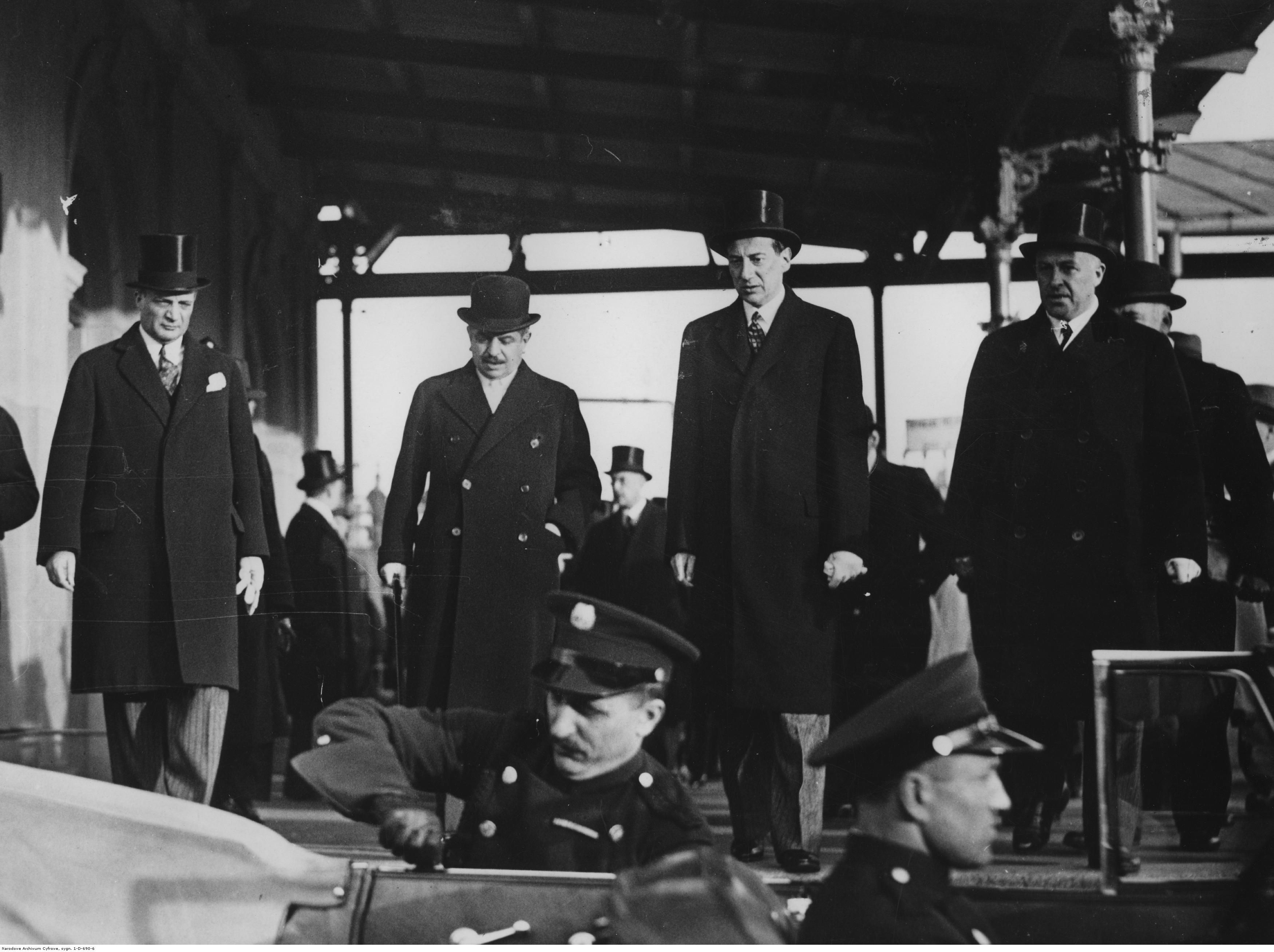 Minister spraw zagranicznych Francji Pierre Laval (drugi z lewej) w towarzystwie ministra spraw zagranicznych Polski Józefa Becka (trzeci z lewej), komisarza Rządu na m.st. Warszawę Władysława Jaroszewicza (czwarty z lewej) oraz szefa Protokołu Dyplomatycznego MSZ Karola Romera (pierwszy z lewej) opuszcza Dworzec Wschodni.