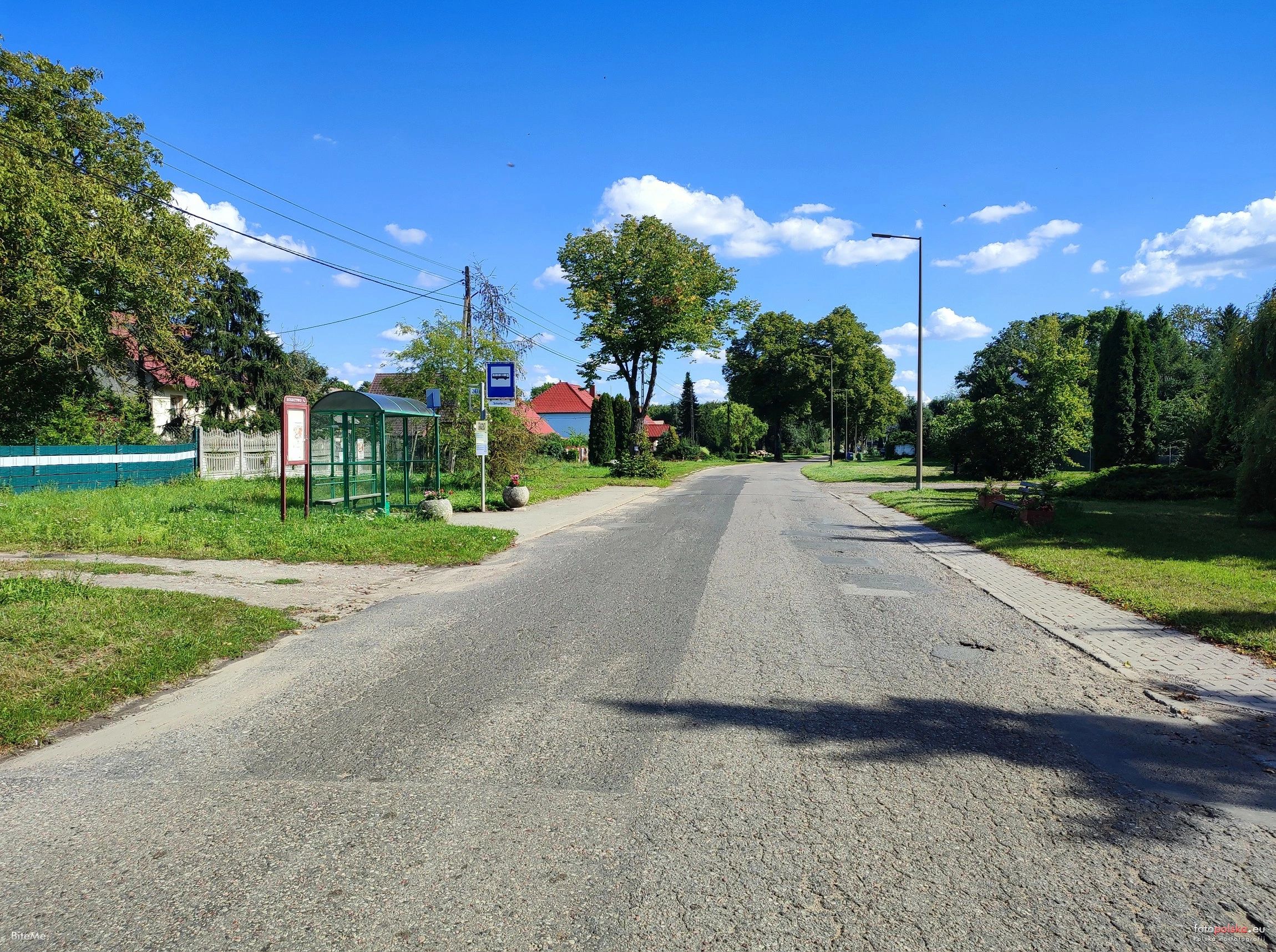 31 sierpnia 2025 , Smolęcin, główna droga przez miejscowość i przystanek autobusowy. Widok na południowy wschód.