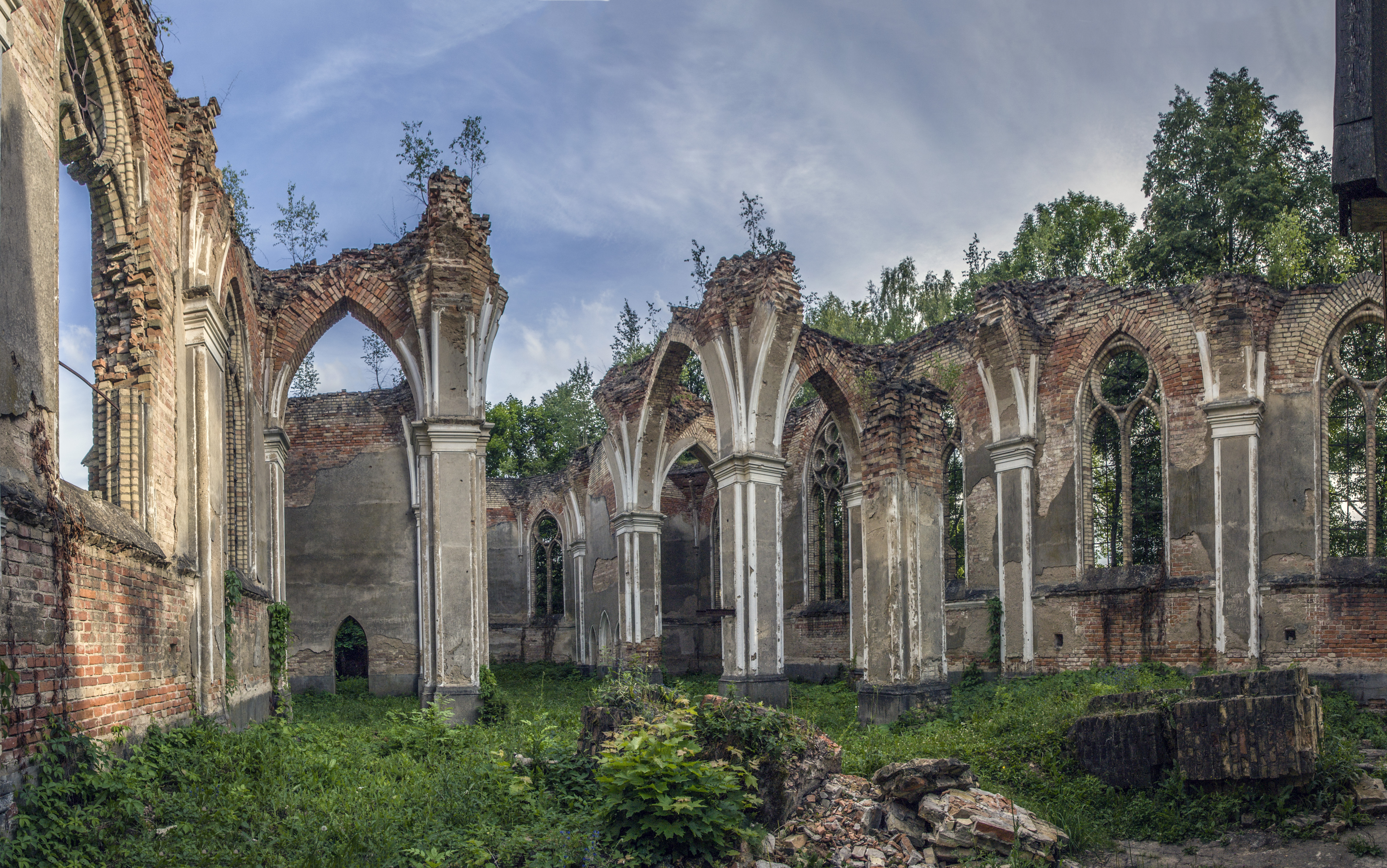 Jednowieżowa świątynia została wzniesiona w stylu neogotyckim. W ruinach zachowały się charakterystyczne dla tego stylu strzeliste okna zakończone ostrym łukiem.