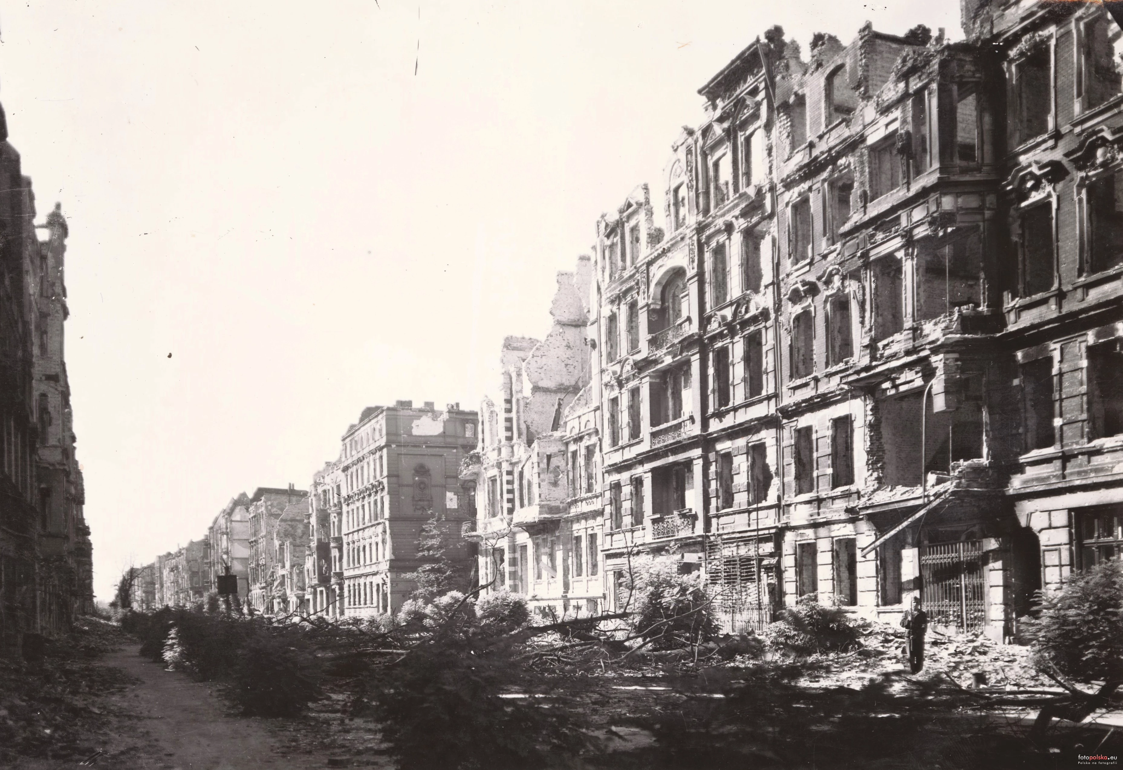 1945 , Ulica Komandorska. Po prawej widoczne skrzyżowanie z ul. Zaolziańską. Widok z północy na południe.Skomentuj zdjęcie |