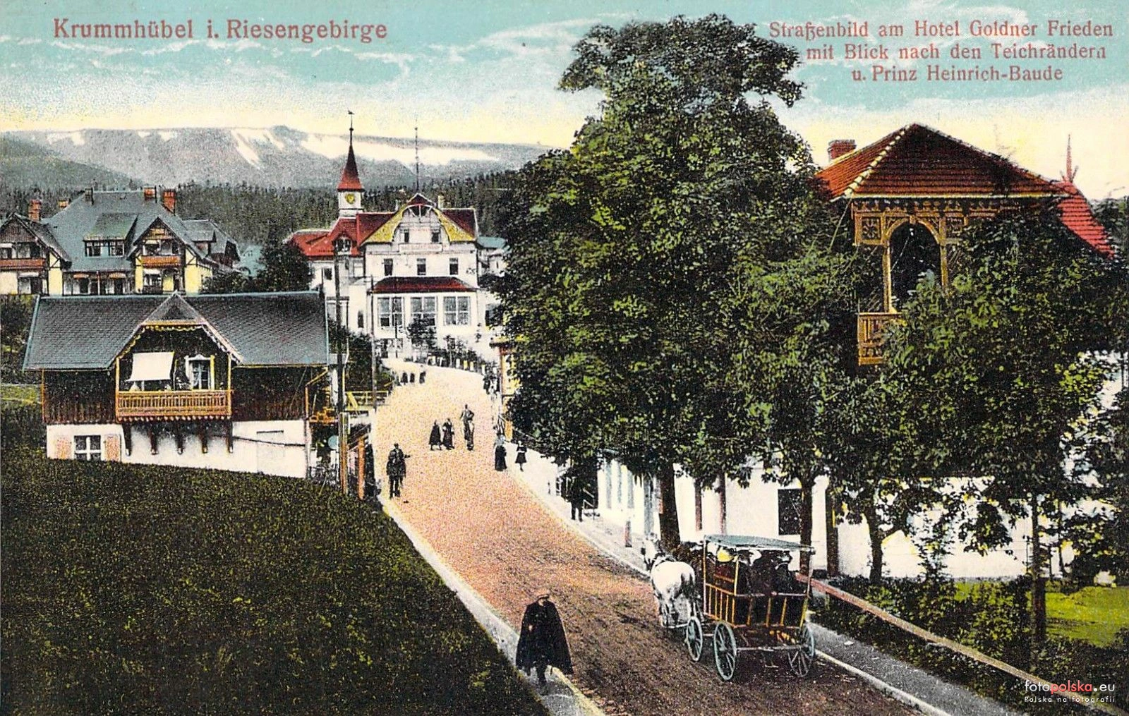 1910 , Fragment dzisiejszej ul. Konstytucji 3 Maja w Karpaczu na widokówce z początku XX wieku. Po prawej ówczesna Villa Irene - obecnie hotel Kolorowa, po lewej budynek nr 53, w tle dom wczasowy Mieszko - wtedy hotel Goldner Frieden. |