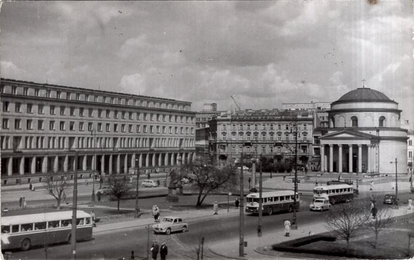 1958 , Plac Trzech Krzyży na pocztówce wydanej przez PTTK w dniu 3 marca 1959 r.Skomentuj zdjęcie