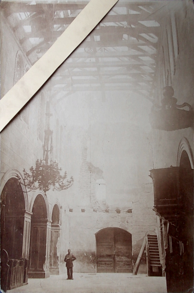1915 , Wnętrze uszkodzonego kościoła w Chorzelach.Skomentuj zdjęcie |