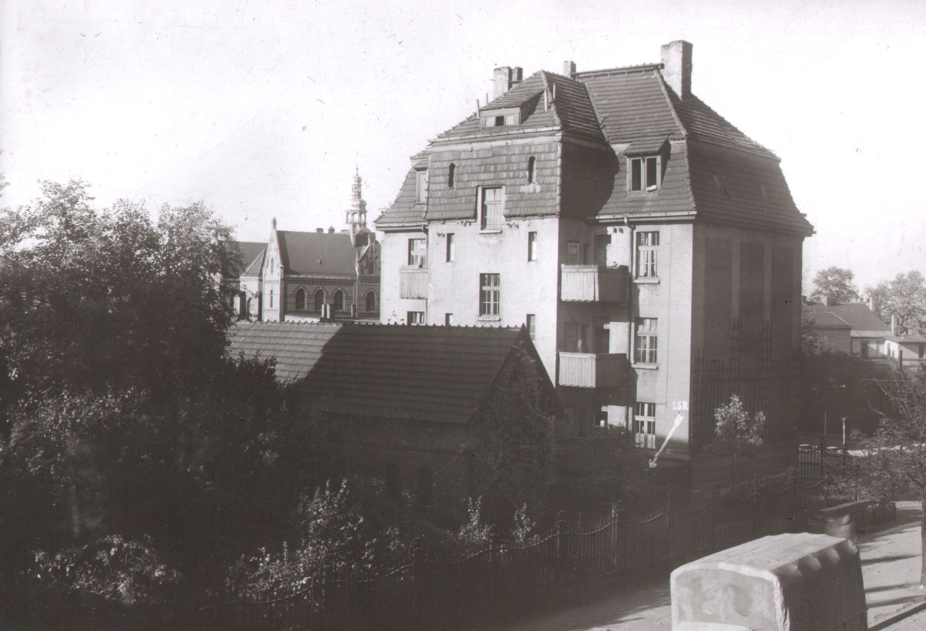 Lata 1939-1945 , Towarowa 1, róg Krakowskiej. Dom nieistniejący. Całkowicie zasłania on Komendę Policji, w tle po lewej widoczna boczna elewacja Centrum Opiekuńczo-Wychowawczego (Starokościelna 8), a za nim wieża Kościoła pw. Narodzenia NMPSkomentuj zdjęcie