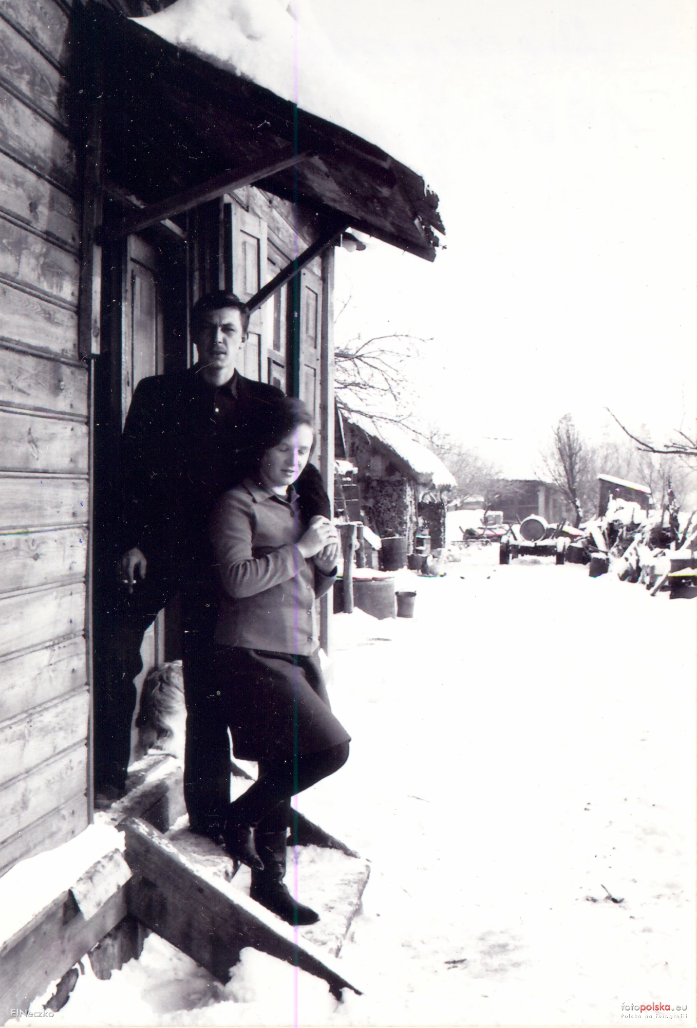 25 grudnia 1967 , Tadeusz Netczuk i Henryka z Puszczów Netczukowie wkrótce po swoim ślubie na progu domu rodzinnego Tadeusza, który wybudował w 1945-1946 r. jego ojciec Eugeniusz. W tle widoczne budynki inwentarskie z 1946 r. - stodoła w tyle oraz obora i stajnia po lewej za domem.Skomentuj zdjęcie |