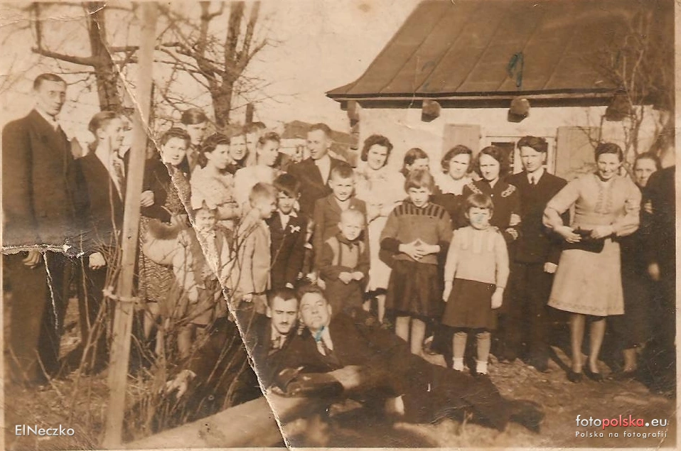 1945 , Zdjęcie domu przy ul. Narutowicza 4 w 1945 r. od podwórka. Ślub Antoniny z Netczuków i Konstantego Jakubowicza. Na zdjęciu rodziny Netczuków, Jakubowiczów i Mankiewiczów.Skomentuj zdjęcie |