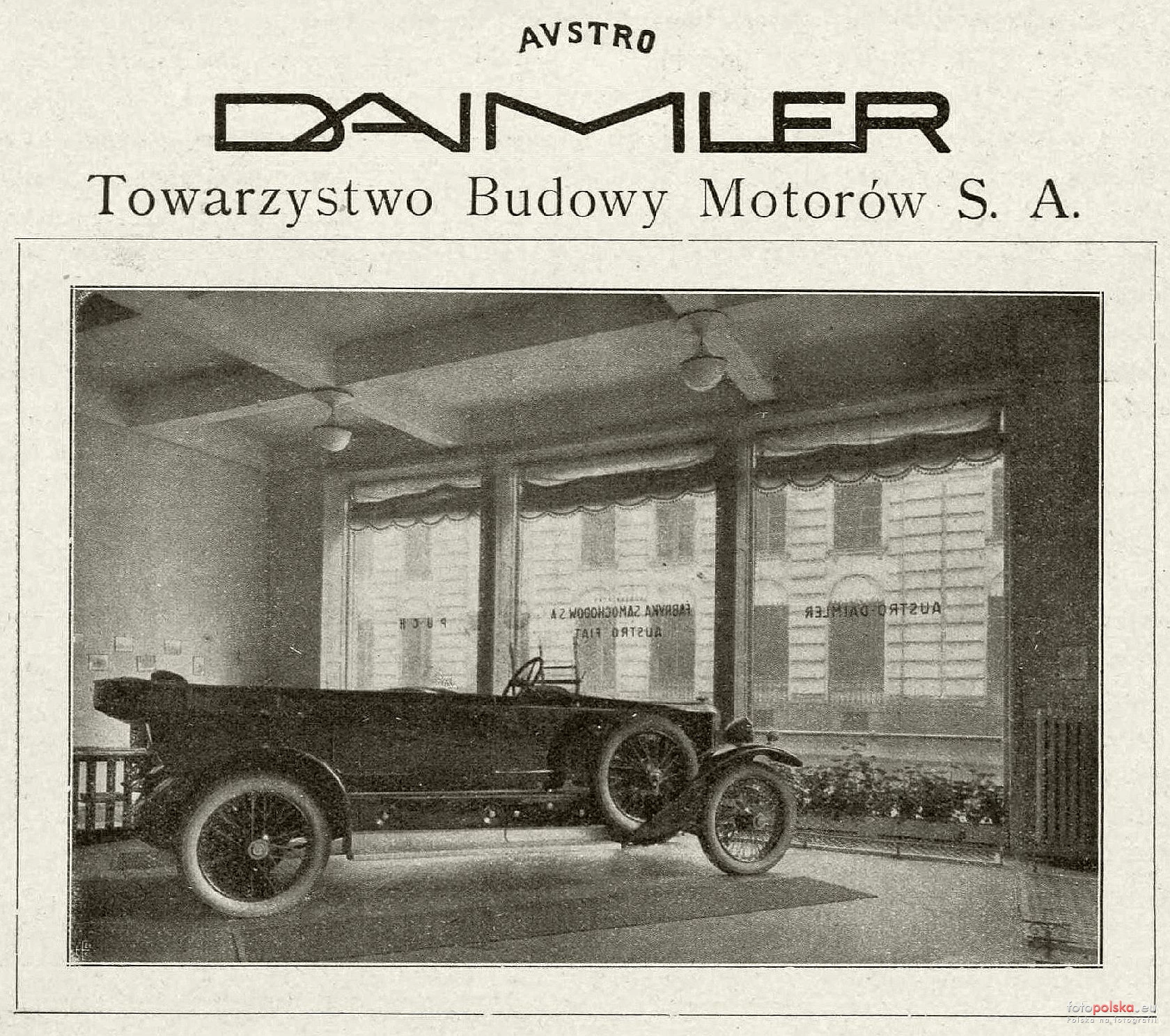 1923 , Wnętrze salonu samochodowego "Austro-Daimler", za szybą widać fragment kamienicy przy ul. Wierzbowej 1. Źródło: Świat : pismo tygodniowe ilustrowane. R. 18, 1923 nr 51 (22 XII)
