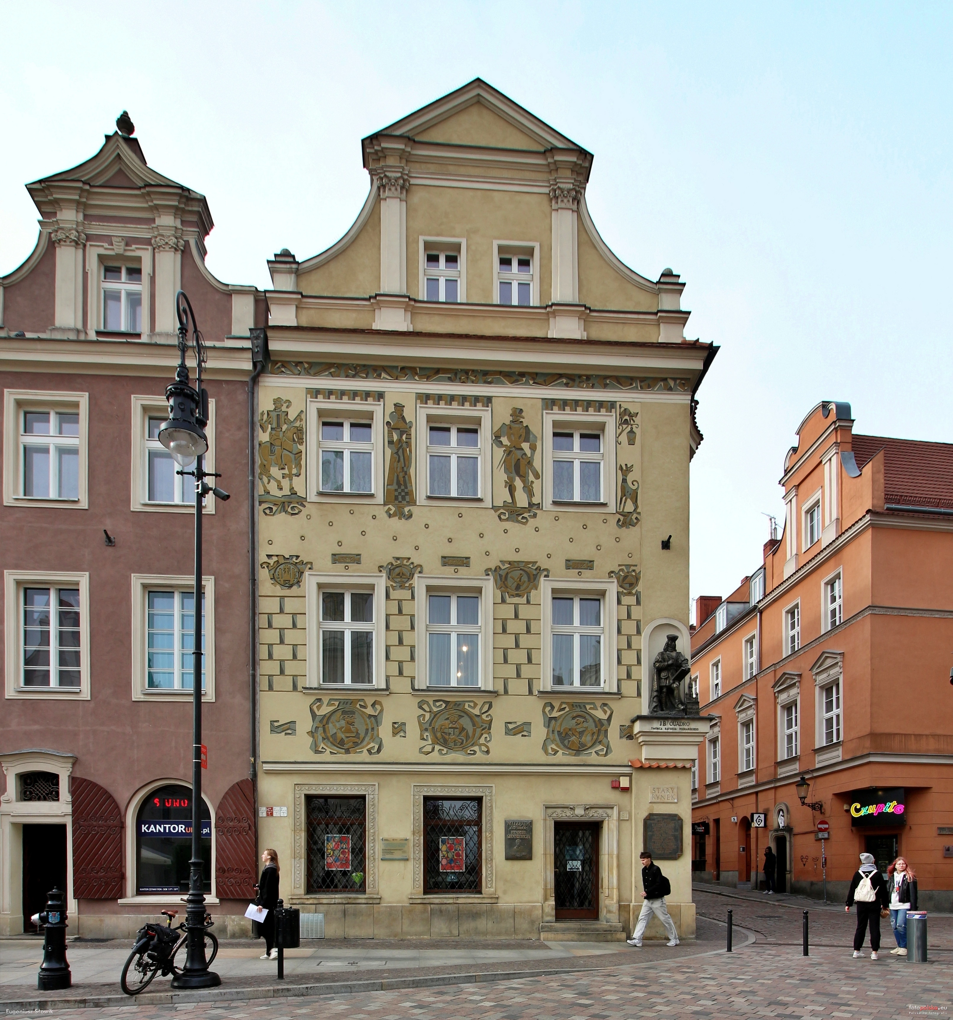 0 pobrań 65 odsłon 6 średnia ocen Poprzednie i następne zdjęcia Eugeniusz S. Obiekty widoczne na zdjęciu Stary Rynek 84 więcej zdjęć (15) Stary Rynek 84 – pierwotnie gotycka kamienica została w latach 1554-1558 przebudowana na zlecenie Jana Rgilowskiego przez Giovanniego Battistę di Quadro, który sam, około 1555 wszedł w posiadanie tejże parceli. Następnie była kilkakrotnie przebudowywana. Uwagę zwraca barokowa fasada z połowy XVIII wieku. W 1959 elewację pokryło nowe sgraffito, przedstawiające G. B. di Quadro na koniu. W narożniku umieszczono również figurę architekta dłuta Władysława Marcinkowskiego ufundowaną przez innego mieszkańca kamienicy – Cyryla Ratajskiego. Obecnie budynek zajmuje filia Biblioteki Raczyńskich oraz Muzeum Literackie Henryka Sienkiewicza, którego założycielem był kupiec – Ignacy Moś. Wikipedia Stary Rynek więcej zdjęć (259) Dawniej: Alter Markt Stary Rynek – kwadratowy plac w Poznaniu wytyczony około 1253 roku. Długość boku wynosi około 141 m. Z każdego z boków wychodzą trzy ulice, z czego dwie skrajne z narożników. Każdą z pierzei podzielono pierwotnie na 16 równych działek. W centralnej części rynku umieszczono ratusz, wagę, sukiennice, kramy, ławy chlebowe, jatki a później także arsenał i odwach. Jest trzecim rynkiem co do wielkości w Polsce i jednym z największych w Europie. Uznawany za jeden z najpiękniejszych w kraju. Rynek przez wiele lat stanowił centrum komunikacyjne miasta, a do 1945 tu mieściła się siedziba władz miasta. Funkcję handlową pełni od swego powstania do dziś. |